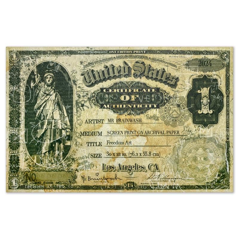 "Freedom Art" is a hand embellished limited edition silk screen print on paper by Mr Brainwash, hand signed and thumb-printed by the artist. The piece comes custom framed with a Certificate of Authenticity. This piece is hand embellished and will vary from piece to piece. Measures approx. 34" x 26" (framed), 30" x 22" (image). This item requires special handling and may have a longer than usual turnaround.