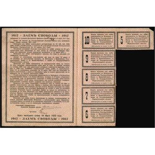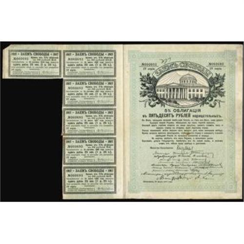 <style type="text/css"> body, td, th { font-family: Arial, Helvetica, sans-serif; font-size: 12px; color: #482424; margin: 0px; padding: 0px; } #header { background-image: url(http://www.bowersandmerena.com/ebay/images/template_v3_01.gif); clear: both; background-color: #590303; border-top-width: 2px; border-top-style: solid; border-top-color: #B38C4F; } #header #header_wrapper { height: 75px; clear: both; width: 800px; margin-right: auto; margin-left: auto; background-image: url(http://www.bowersandmerena.com/ebay/images/template_v3_03.gif); background-repeat: no-repeat; background-position: right; color: #F3EDCC; } #header #header_wrapper #header_logo { float: left; height: 75px; width: 444px; background-image: url(http://www.bowersandmerena.com/ebay/images/template_v3_02.gif); background-repeat: no-repeat; font-size: 10px; text-transform: capitalize; color: #B38C4F; } #header #header_wrapper #header_right { float: left; height: 75px; width: 356px; text-align: right; } #header #header_wrapper #header_right #headerLoginBtn { margin-bottom: 30px; } #header #header_wrapper #header_right input#txtSearch { color: #B49056; border: 1px solid #B49056; width: 175px; padding-top: 3px; padding-right: 3px; padding-bottom: 4px; padding-left: 3px; } #nav { height: 37px; background-image: url(http://www.bowersandmerena.com/ebay/images/template_v3_05.gif); clear: both; } #nav #nav_wrapper { height: 35px; width: 800px; margin-right: auto; margin-left: auto; border-left-width: 1px; border-left-style: solid; border-left-color: #B38C4F; } #nav #nav_wrapper a { padding-right: 15px; padding-left: 15px; border-right-width: 1px; border-right-style: solid; border-right-color: #B38C4F; height: 25px; padding-top: 10px; display: block; float: left; text-decoration: none; font-weight: bold; color: #5D0303; } #nav #nav_wrapper a:hover { color: #B38C4F; } #nav #nav_wrapper #search { float: right; padding-top: 7px; } #nav #nav_wrapper #search #txtSearch { font-family: Arial, Helvetica, sans-serif; font-size: 10px; text-transform: uppercase; color: #D2AE75; border: 1px solid #B38C4F; padding: 3px; } #content_bgd { background-image: url(http://www.bowersandmerena.com/ebay/images/template_v3_09.gif); background-repeat: repeat-y; background-position: center; padding-top: 15px; padding-bottom: 15px; background-color: #FBFBDB; } #content_wrapper { clear: both; height: auto; width: 800px; margin-right: auto; margin-left: auto; } .LotDetailWhite { line-height:normal; font-size:13px; font-family: arial,helvetica,sans-serif; color: White; font-weight: bold; } .LotDetailInformation { line-height:normal; font-size: 13px; font-family: arial,helvetica,sans-serif; } .LotDetailMessage { line-height:normal; font-size: 13px; font-family: arial,helvetica,sans-serif; color: red; } } tr.HeaderAuctionTitle td { color: #000000; font-weight: bold; padding: 2px; background-image: url(http://www.bowersandmerena.com/ebay/images/template_v3_05.gif); background-repeat: repeat-x; border-bottom-width: 1px; border-bottom-style: solid; border-bottom-color: #B38C4F; } table.AuctionSummary a, table.AuctionSummary a:link, table.AuctionSummary a:visited { color: #0000FF; text-decoration: none; } } td.tableHeaderLeft { border-left-width: 1px; border-left-style: solid; border-left-color: #B38C4F; } td.tableHeaderRight { border-right-width: 1px; border-right-style: solid; border-right-color: #B38C4F; } td.tableCellMiddle { border-left-width: 1px; border-left-style: solid; border-left-color: #B38C4F; border-right-width: 1px; border-right-style: solid; border-right-color: #B38C4F; padding: 5px; } tr.footer td { border-top-width: 1px; border-top-style: solid; border-top-color: #B38C4F; } </style> </head> <body> <div id="header"> <div id="header_wrapper"> <div id="header_logo"> </div> <div id="header_right"> </div> </div> </div> <div id="nav"> <div id="nav_wrapper"> <a href="http://www.bowersandmerena.com">Our eBayLive Auctions</a> <a href="#PaymentInfo">Payment Information</a> <a href="#ShippingInfo">Shipping Information</a> <a href="#About">About Bowers and Merena</a> </div> </div> <div id="content_bgd"> <div id="content_wrapper"> <table width="100%" border="0" cellpadding="5" cellspacing="0" class="AuctionSummary"> <tbody> <tr class="HeaderAuctionTitle" style="height: 25px;"> <td align="left" class="tableHeaderLeft" > </td> <td align="center" class="tableHeaderRight"> <span style="font-size: large;">Lot #2413. 1917-Dated "Freedom Temporary Government" Bonds for World War I.</span> </td> </tr> <tr> <td colspan="3" class="tableCellMiddle"> Lot of 6 different Russian Bonds. All are dated 1917. Denominations include 20 Rubles; 50 Rubles (2); 100 Rubles (2); 500 Rubles. Various amounts of coupons are attached. All with impressive building with Greek Doric column Vignettes in different colors. Condition generally Fine to XF+. Scarce group.