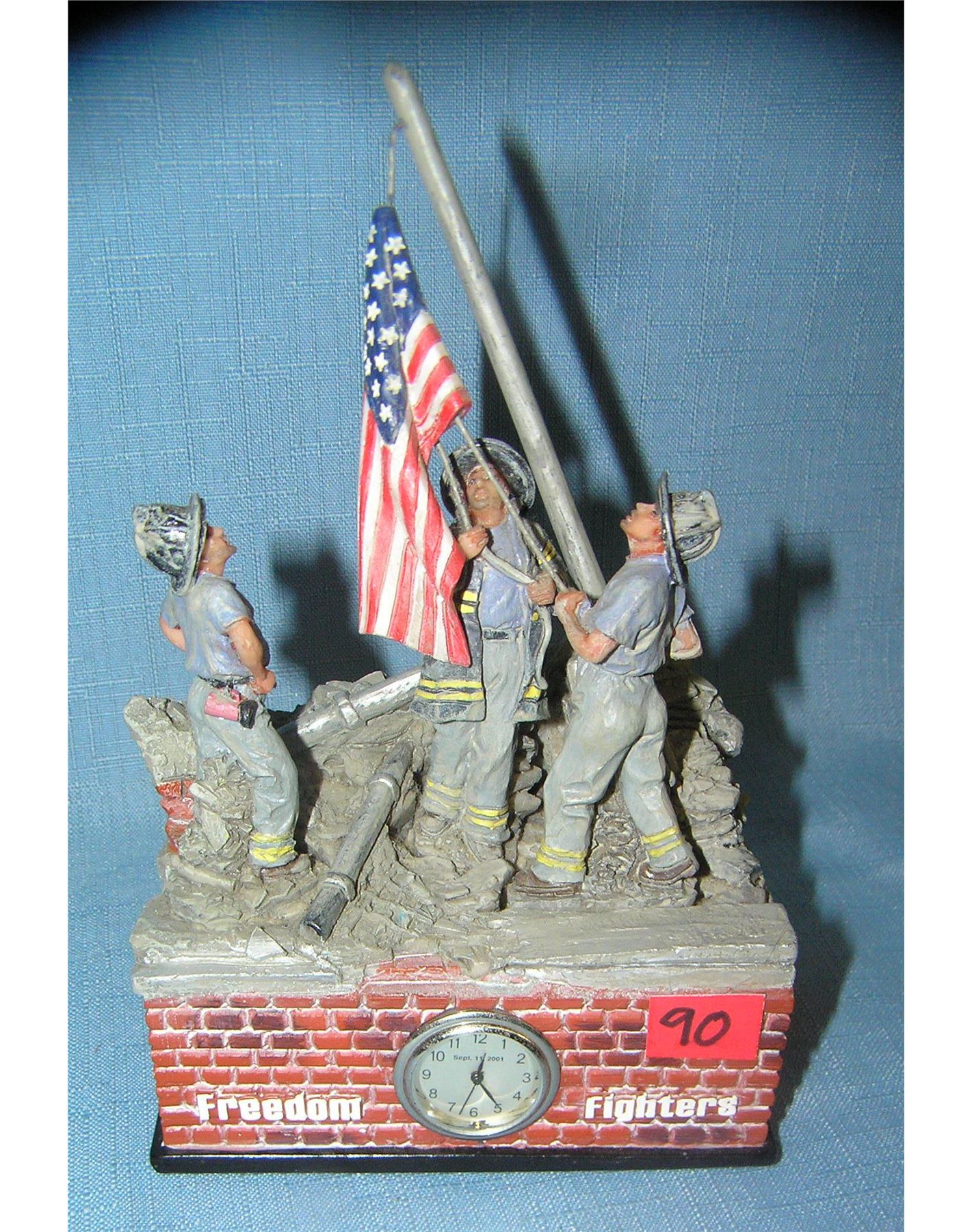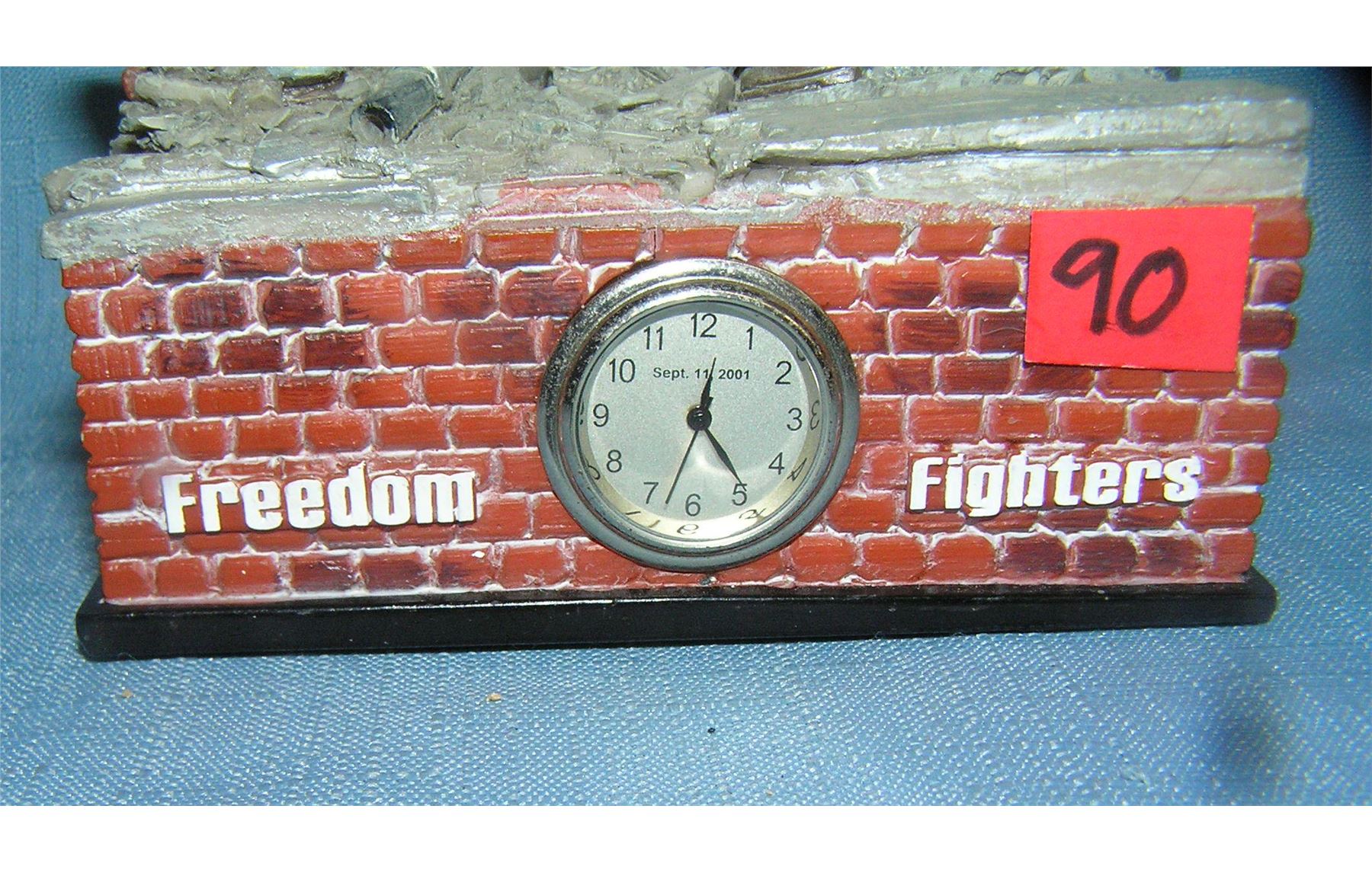 Freedom fighters America's pride 9/11 commemorative piece features FDNY fire fighters raising the American flag also has a built in clock inscription on rear and felt based est. value $40.00-$50.00