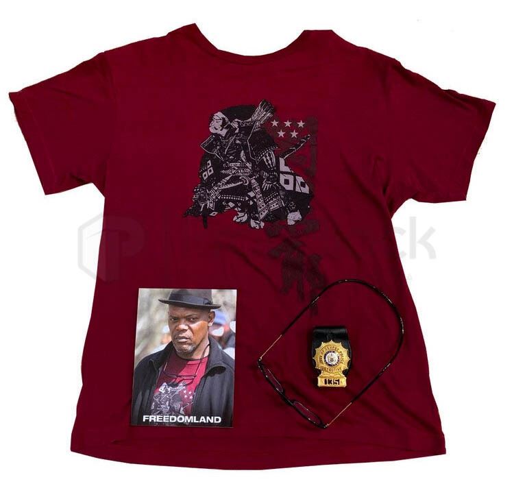 Collection of original props used by the character of Lorenzo Council, actor Samuel L. Jackson in the 2006 crime thriller Freedomland. A black police detective must solve a strange case of a kidnapped boy and deal with a big racial protest. This set consists of a red t-shirt with black graphic, a pair of black framed glasses with neck strap and a metal police badge with black leather holster. This set remains in excellent, production used condition.