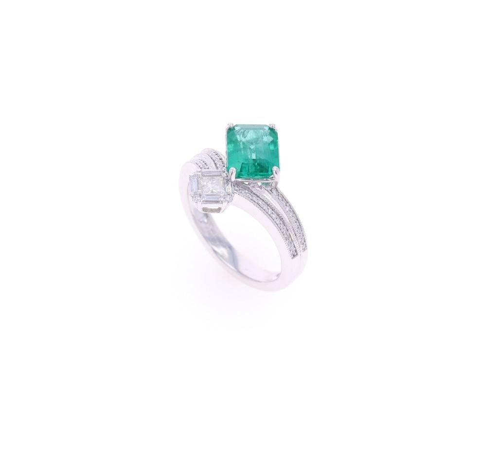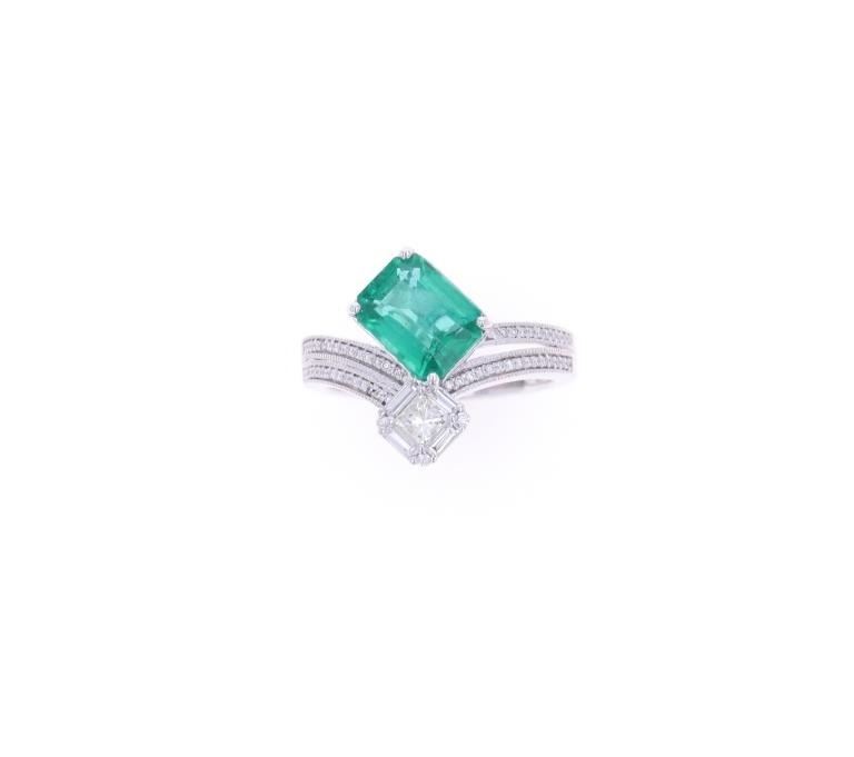 Featured in this lot is this freeform 2.07ct emerald and diamond platinum ring with AIGL paperwork. The ring features a polished, stamped, and tested platinum construction that is marked as follows: Gadi Shemesh Los Angeles - PT950. The ring features a freeform design with a two stone setting with the larger gemstone featuring a natural octagonal emerald that shows measurements of 8.9 x 6.8 x 4.5mm with green coloration and a very good cut grade with a total weight of 2.07ct. The second gemstone is a princess cut diamond that shows measurements of 3.2 x 3.2mm and is considered G - H coloration and SI1 - I1 clarity. The freeform design is decorated with a total of 64 baguette and round brilliant diamonds that shows measurements of 2.5 x 1mm (baguette) and 0.9 - 1.2mm (round) and shows clarity of SI1 - I1 and a color grade of G - H and an overall diamond weight of 0.49ct. The piece comes complete with AIGL Inc.(American International Gemological Laboratories, Inc. a GIA certified lab AIGL#: K61E12-EA20733) report and appraisal confirming the above info and giving a total value of $18,447.00.00. The ring size is US 7. RN037215