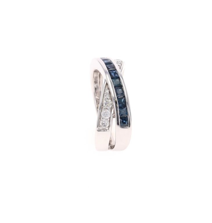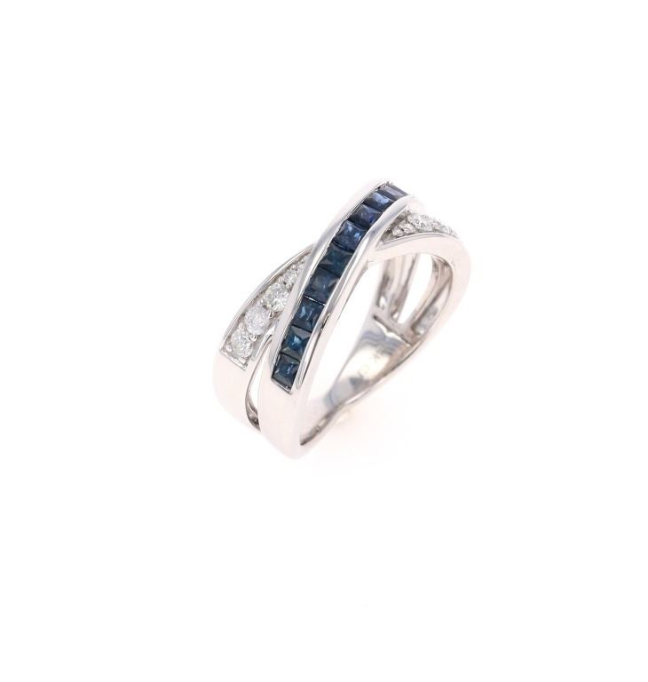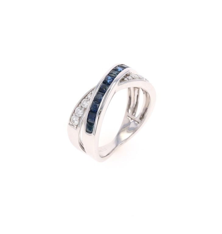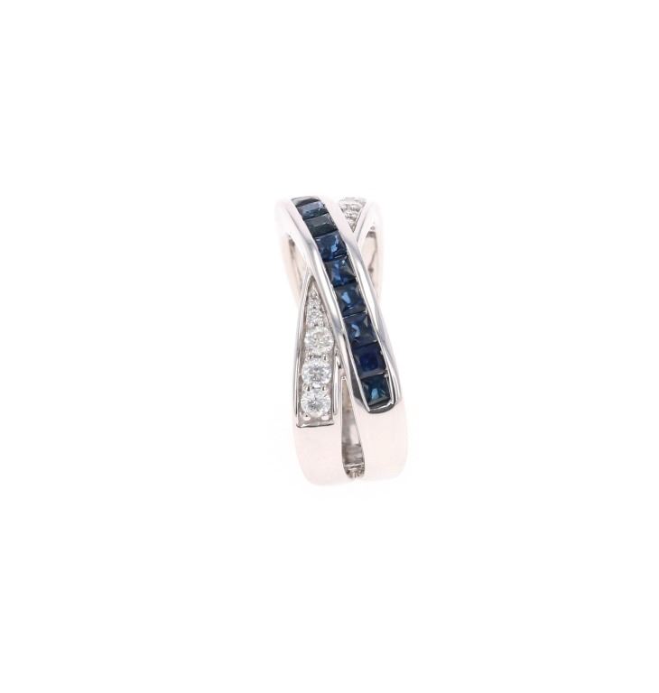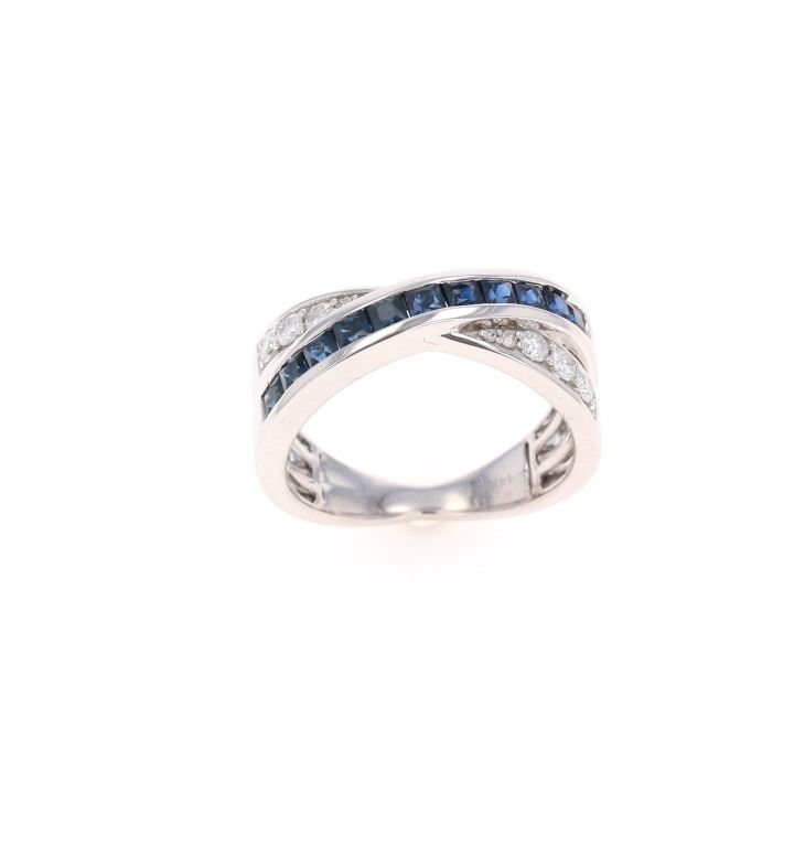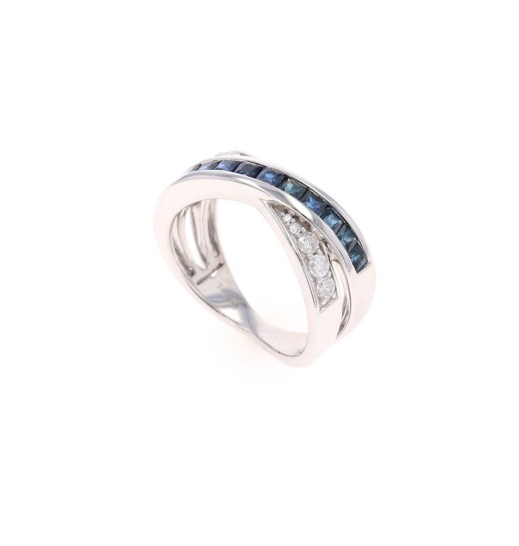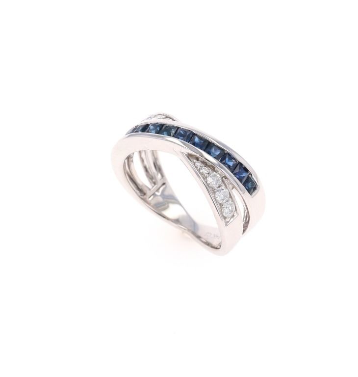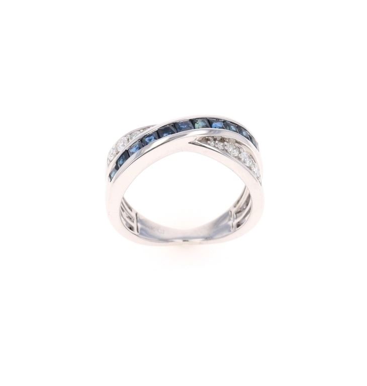 Featured in this lot is this freeform blue sapphire and diamond 14k white gold ring. The ring features a wonderfully and professionally crafted 14k white gold construction that is marked with the Color Jewels hallmark 'CJ' and is marked '14k' next tot he hallmark. The ring features a double band freeform design that are decorated with a total of 11 cannel set rectangular blue sapphires that shows a total weight of 1.01 carats. The second band is decorated with a total of 10 round brilliant cut diamonds that shows a total weight of 0.27 carats. The ring size is US 7.