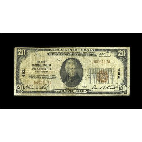<B>Freehold, NJ</B></I> - $20 1929 Ty. 1 <B>The First NB</B></I> Ch. # 452<BR>A respectable <B>Fine</B></I> with consistent and even natural soiling. <B>Fine.</B></I>