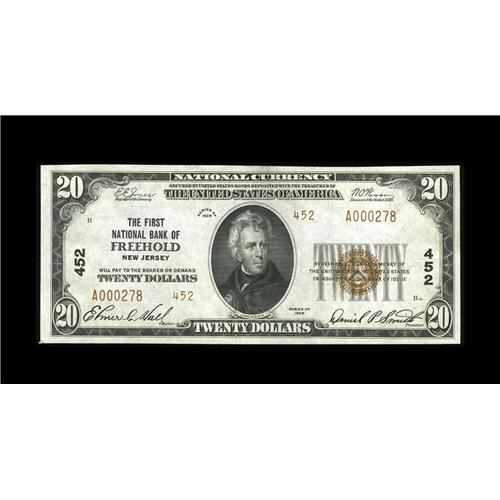 <B>Freehold, NJ</B></I> - $20 1929 Ty. 2 <B>The First NB</B></I> Ch. # 452<BR>This is a very scarce and seldom offered bank in small size, with Type 2's especially scarce. The Kelly census shows just a $10 uncut sheet and one Type 2 $20, which grades only Fine. <B>About Uncirculated.</B></I> <BR><BR><B>Important notice:</B> Heritage usually auctions material at the rate of 200-250 lots per hour. On some occasions eBay Live bid software or the Internet may not be able to keep up with the pace of the auction. We recommend placing a realistic absentee bid now as insurance to avoid disappointment. Occasionally the auctioneer may eliminate or reject an eBay Live bid, and the auctioneer may also reopen a lot after the close of the eBay live bidding (usually because we missed an audience bid), and may reject your bid even if it shows you as the winning bidder. By bidding via eBay Live, you agree that Heritage may award the lot to another bidder at its sole discretion under the circumstances described above or any other reasonable circumstances. Since eBay bids are not shown to us until we open the lot on the floor, we treat those bids just like floor bids. In most cases the floor responds before the eBay bid is presented to us, due to Internet lag time, so for consistency we have made it a policy that floor bids are always considered first over tie eBay live bids. Also please note that all Heritage lots purchased through eBay Live carry a 20% Buyer's Premium. Please make sure you read the Terms and Conditions before you bid. This lot is being auctioned in conjunction with a live floor auction by Heritage Galleries & Auctioneers. All final auction and invoice information will be supplied by Heritage Galleries & Auctioneers, and all other information should be considered preliminary. Lot:17759 <BR><BR><B>Winning Notification and Billing:</B> After the FINAL session in this auction is complete, Heritage will send e-mail and snail mail invoices. This process normally takes several days. All final auction and invoice information will be supplied by Heritage Galleries & Auctioneers, and all other information should be considered preliminary. <BR><BR>This auction will be conducted on a live auction floor and over the Internet through eBay Live. If you choose to place an absentee bid, please take a moment to <font color='#0000ff'><u><a href='http://pages.ebay.com/liveauctions/help/before/laabsentee.html'>learn how eBay Live absentee bidding works</a></u></font><font color='#000000'>