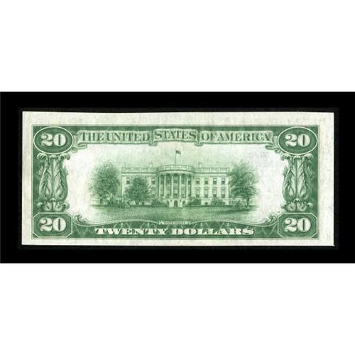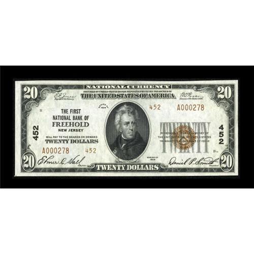 <B>Freehold, NJ</B></I> - $20 1929 Ty. 2 <B>The First NB</B></I> Ch. # 452<BR> All the attributes wanted in a Gem, including solid margins, bold embossing, and original paper are all present. There is however a light center bend that prevents such a lofty grade. In 2006, as part of our Central States Signature Auction, this note realized over $2,400. <B>Choice About Uncirculated. </B></I><BR><BR><b>Shipping:</b> Coins & Currency (<a target="_blank" href="http://www.heritageauctions.com/common/shipping.php">view shipping information</a>)