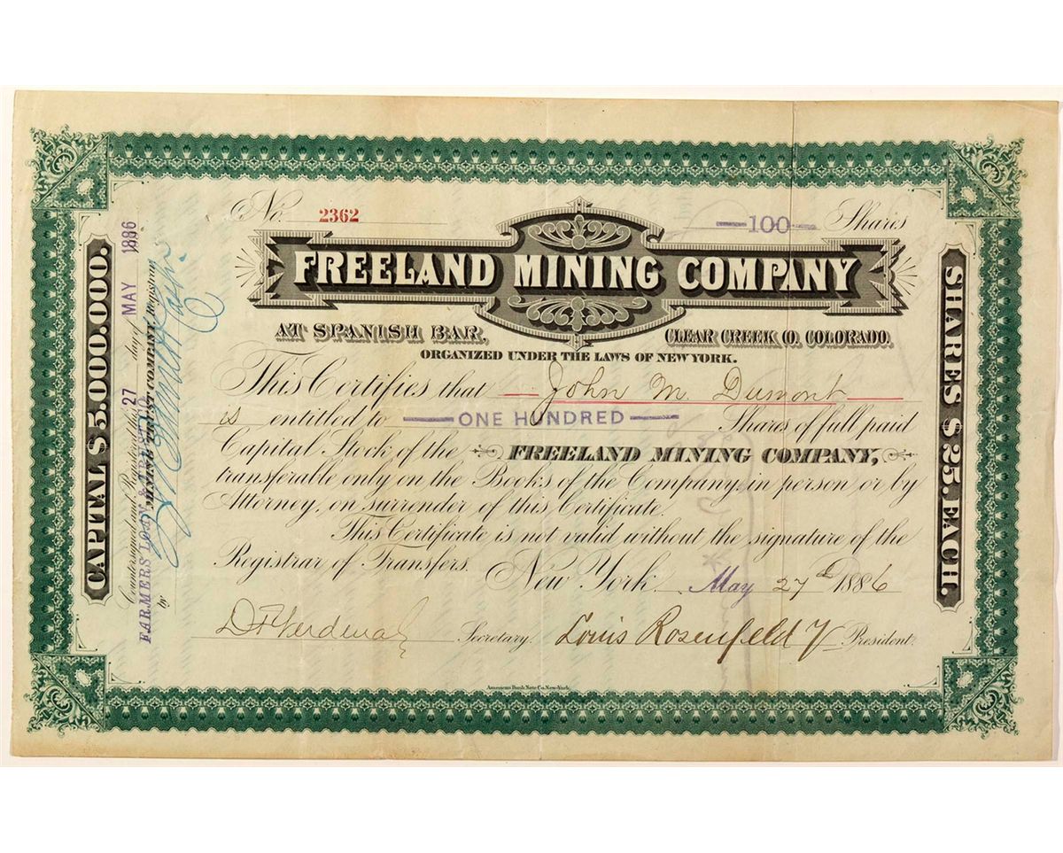 Incorporated in New York. Cert. #2362 issued May 27, 1886 to John M. Dumont for 100 shares. Signed by D. Herdeval, secretary and Louis Rosenfled, President. The mines in Freeland benefited the population of the town that was founded in about 1880. The site is near Idaho Springs. When the mines faded, so did the town. Today, there are a few relics left including the shaft houses and mine dumps [ghosttowns.com]. In 1886 alone, Clear Creek County boasted a grand total of $2,725,053 in ore, second only to Lake County (likely coming from Leadville) [Kimball, Production of Gold and Silver in the United States, 1886].
