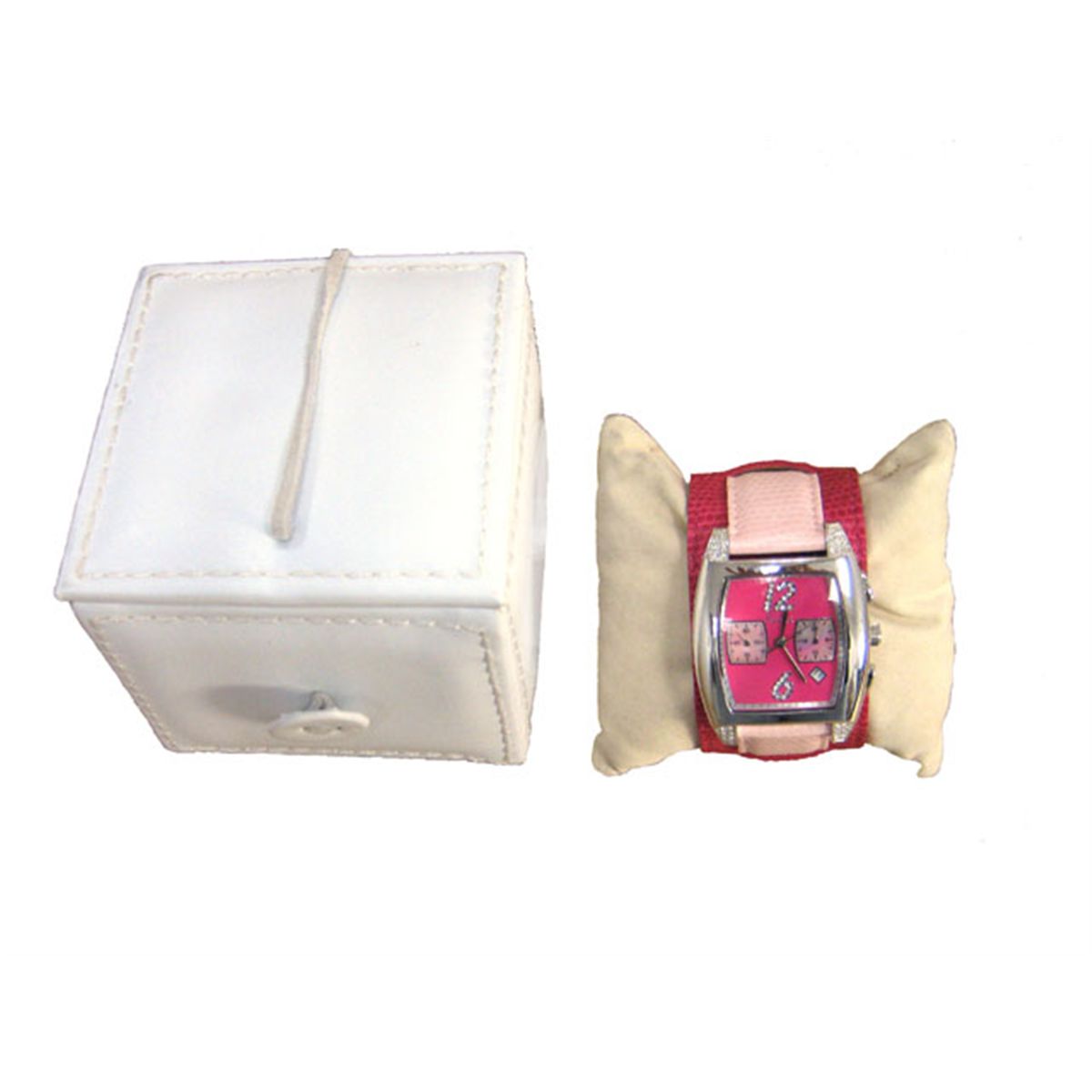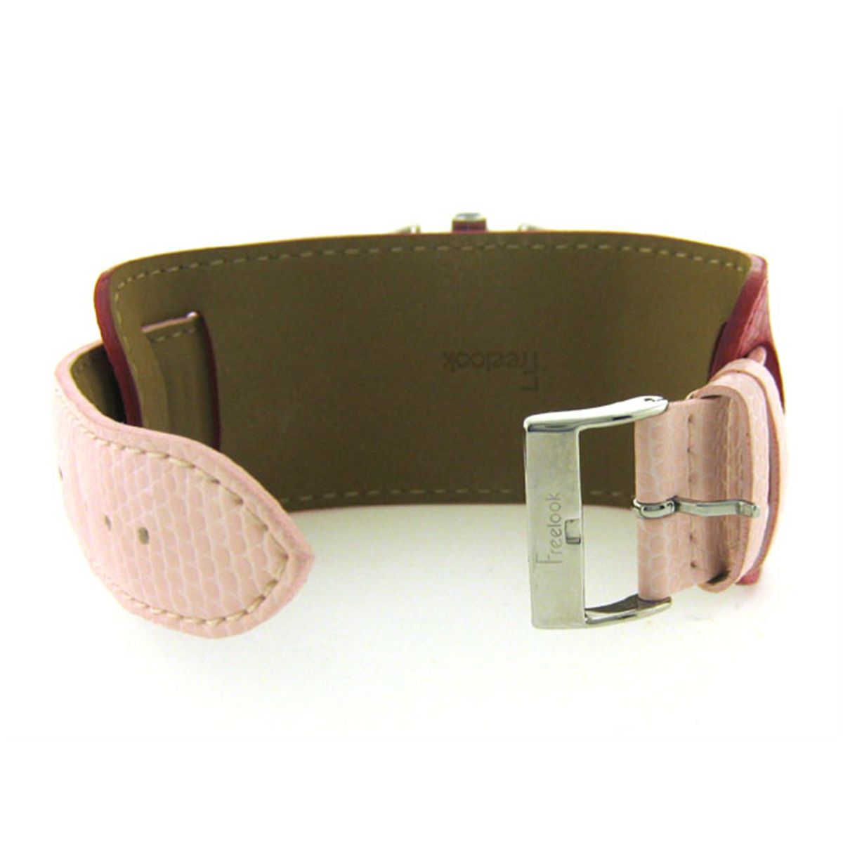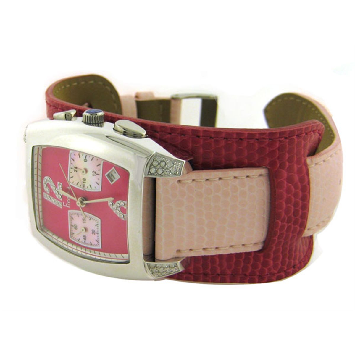 This is a Freelook Women's HA1081CH-5 Pink Dial Leather Band Watch pink leather watchband with buckle clasp wide leather cuff; pink dial with large Arabic numeral indexes studded with crystal stones at six and 12 o'clock; subdials display a 24-hour clock and seconds indexes; crystals inset on the edges of the sturdy, silver-toned brass case; mineral crystal is scratch resistant; Japanese quartz movement.