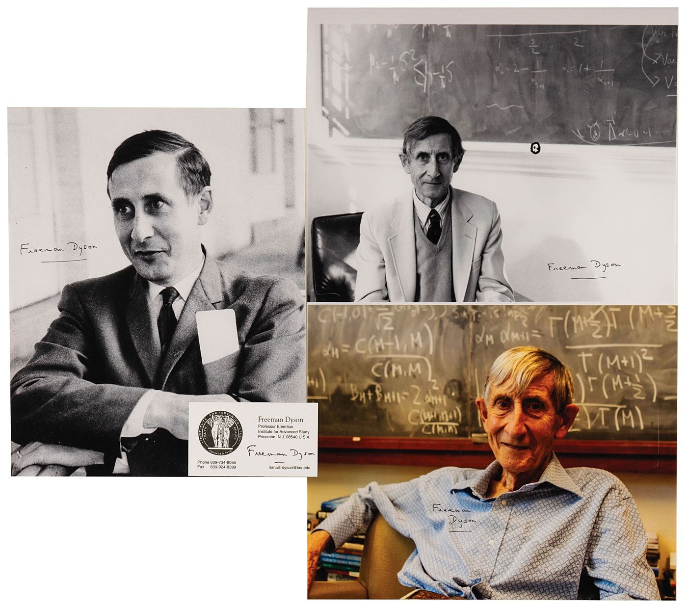 Group of three glossy photos of Freeman Dyson at various stages of his career, 10 x 8 and 8 x 10, each signed in black ink. Also included is an Institute for Advanced Study business card belonging to Dyson, which is also signed in black ink. In overall fine condition.