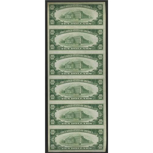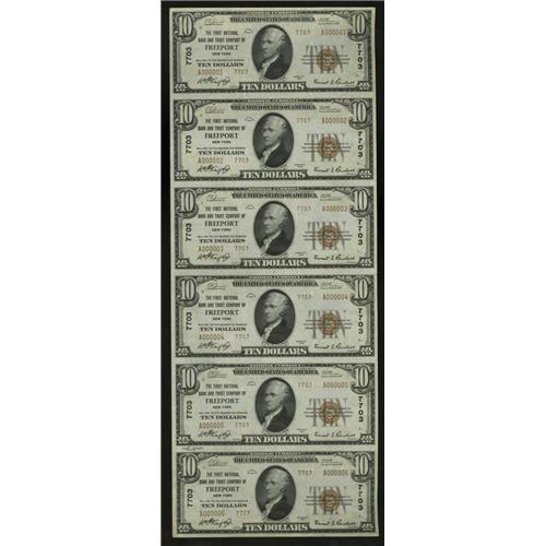 <B>Freeport, NY</B></I> - $10 1929 Ty. 2 <B>The First NB & TC</B></I> Ch. # 7703 Uncut Sheet<BR>This serial number 1-6 uncut sheet has most of its handling restricted to the bottom note and that includes a large corner fold. However, there are no folds between the notes. Overall <B>Crisp Uncirculated.</B></I><BR><BR><b>Shipping:</b> Coin/Currency (<a target="_blank" href="http://www.heritageauctions.com/common/shipping.php">view shipping information</a>)