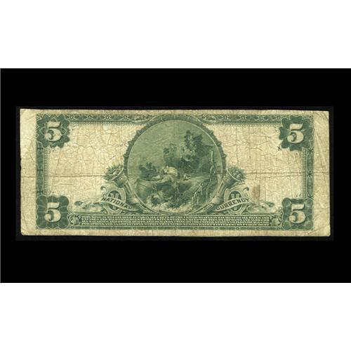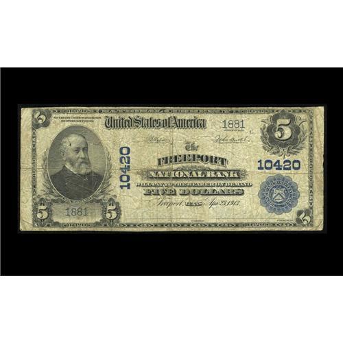 <B>Freeport, TX</B></I> - $5 1902 Plain Back Fr. 604 <B>The Freeport NB</B></I> Ch. # 10420<BR>A just plain rare Brazoria County bank which was the sole bank here to issue. A mere $740 was outstanding from the bank in large size by 1935, with this town missing entirely from the Everson, Ivy and Permian Basin collections. <B>About Fine.</B></I>