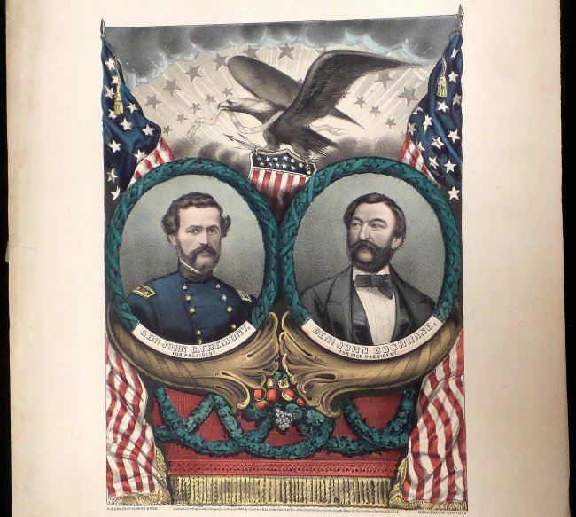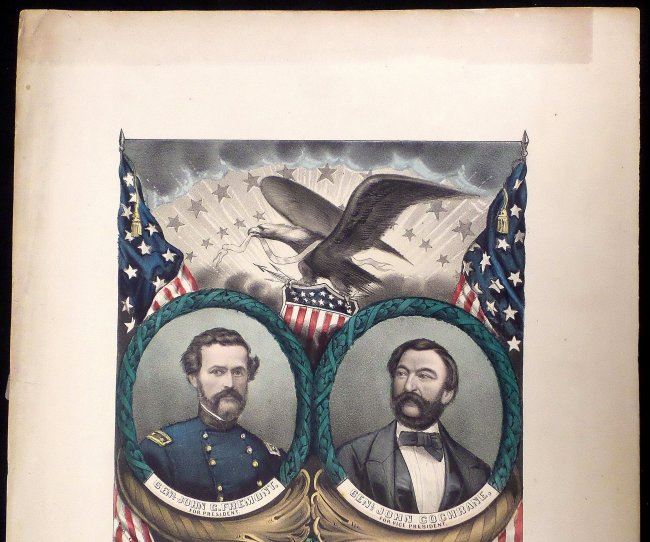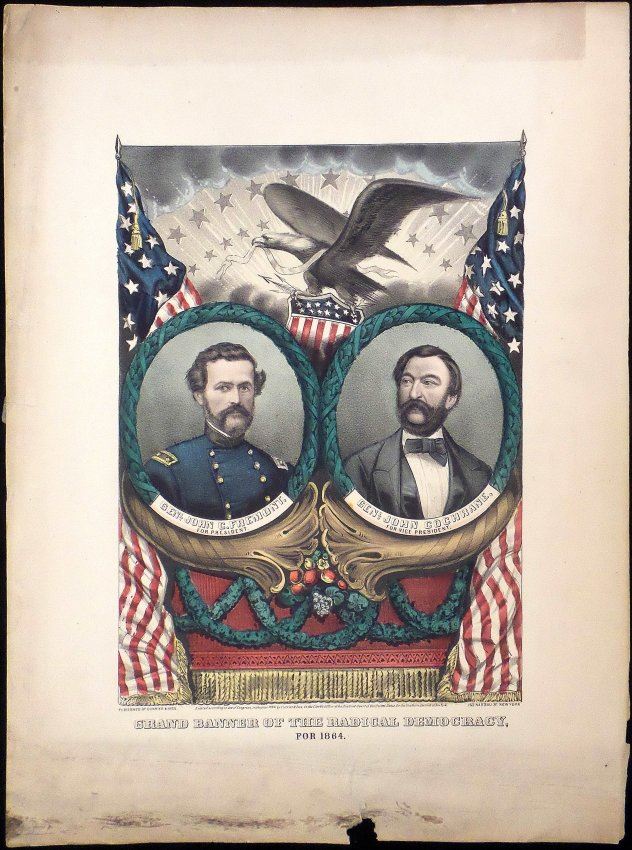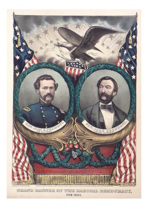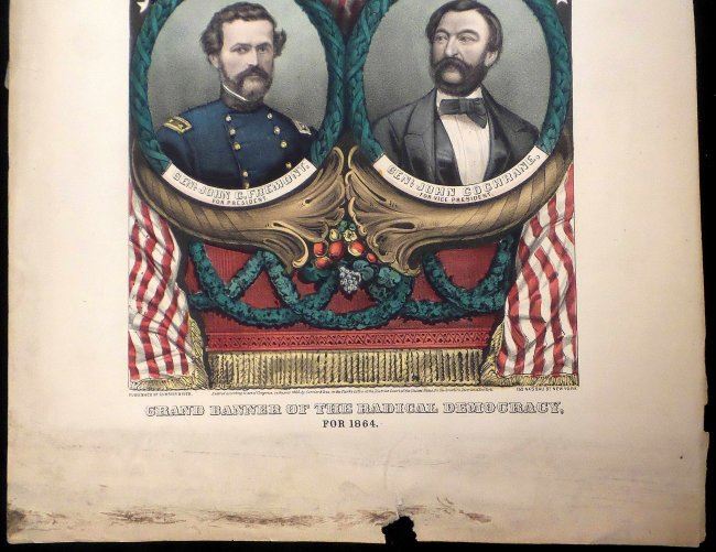 Hand-colored lithograph published by Currier & Ives, titled "Grand Banner of the Radical Democracy / for 1864". Features jugate portraits of General John C. Fremont and General John Cochrane contained within an oval laurel surround surmounted by an eagle clutching an American shield [Image: 12-1/4" H x 8-7/8" W; Sheet: 17-3/4" H x 13-1/2" W]. Uneven age-toning, and few minor stains on image. Margin defects include staining, loss at bottom edge, and wear.