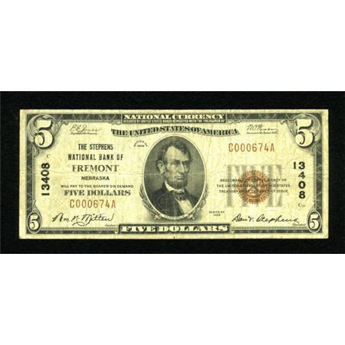 <B>Fremont, NE</B></I> - $5 1929 Ty. 1 <B>The Stephens NB</B></I> Ch. # 13408<BR> This evenly circulated issue is fully original with solid paper. <B>Fine.</B></I><BR><BR><b>Shipping:</b> Coins & Currency (<a target="_blank" href="http://www.heritageauctions.com/common/shipping.php">view shipping information</a>)