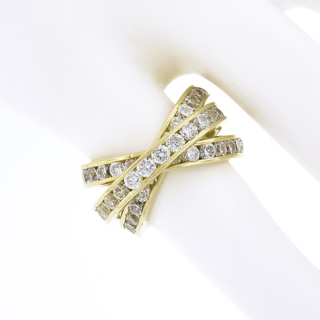 A solid 18k yellow gold french trinity band ring, with numerous of round cut cubic zirconia (2.5mm each). The ring is size 5.5, weighs a total of 12.80 grams, and measures 4.9mm wide.
