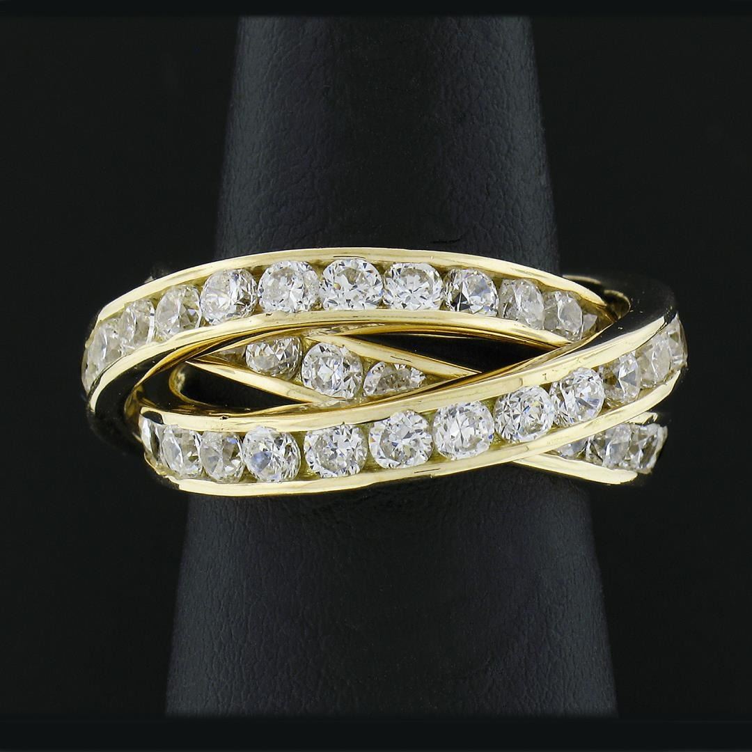 A solid 18k yellow gold french trinity band ring, with numerous of round cut cubic zirconia (2.5mm each). The ring is size 5.5, weighs a total of 12.80 grams, and measures 4.9mm wide.