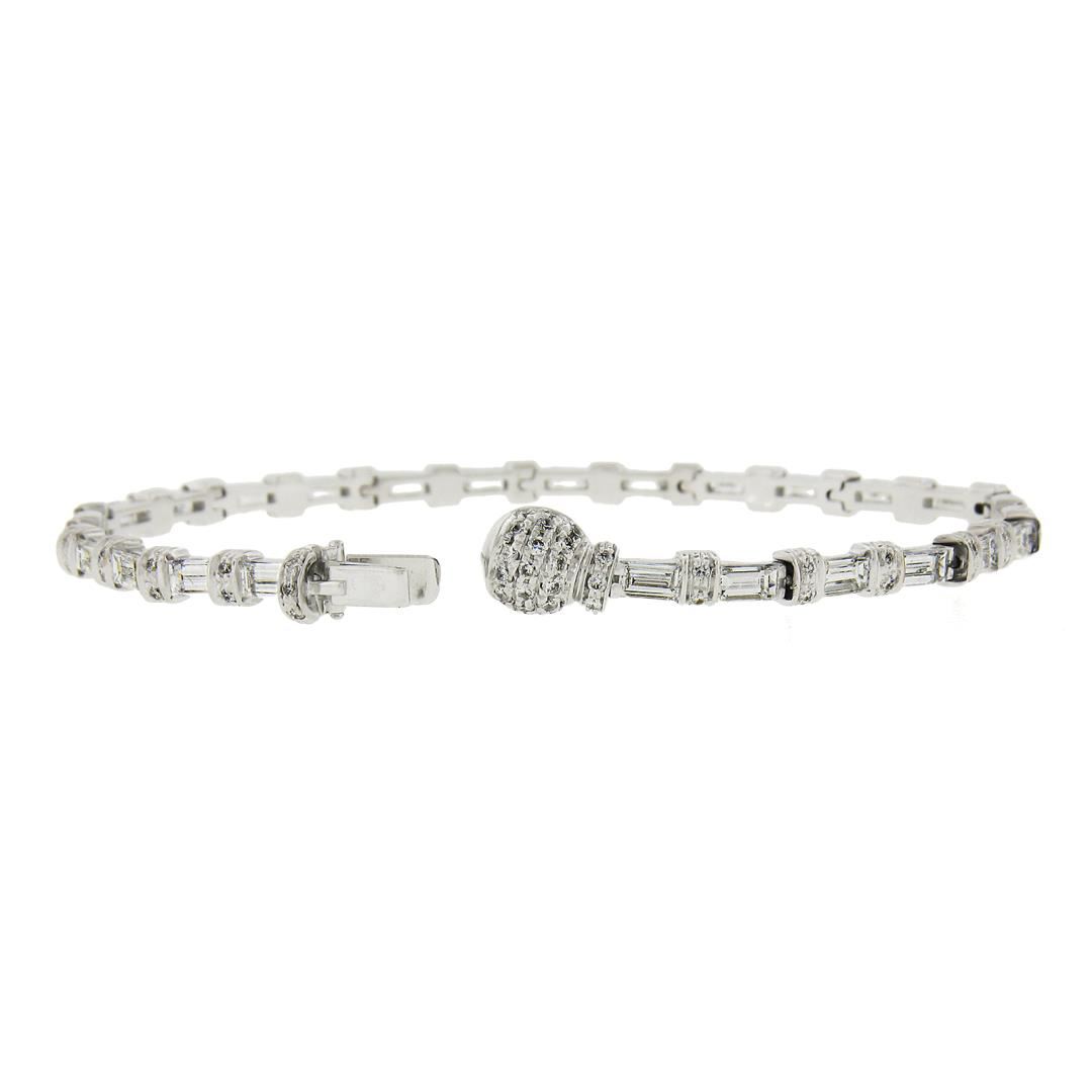 A solid 18k white gold line braceler, featuring 26 straight baguette cut natural diamonds (F/G - VVS2-VS2 ; 3.69ctw), and 75 round cut natural diamonds (G/H - VS1-SI1 ; 0.40ctw). It weighs a total of 12.42 grams, measures 7.1mm wide, and measures 7.0 inches in length.