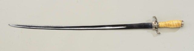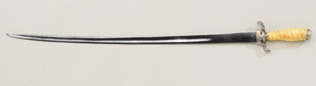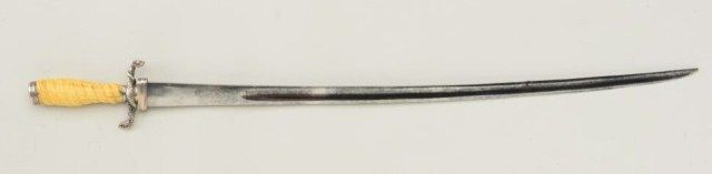 French 18th century hunting style sword with silver mounts and fluted bone grip and original scabbard. The sword measures 29-1/2” overall with a 24-1/2” blade. The blade is in very good condition showing a lightpolish. The cross guard shows figures of serpents with scales. The pommel cap shows a floral design which is matching to the mounts on the scabbard. The bone grip is carved in circular pattern and in good condition withyellowish patina and minor cracks. The leather scabbard has broken but three (3) piece mounts are retained and the leather can be reinforced and restored. The mounts are sharp. Est.; $2,000-$4,000