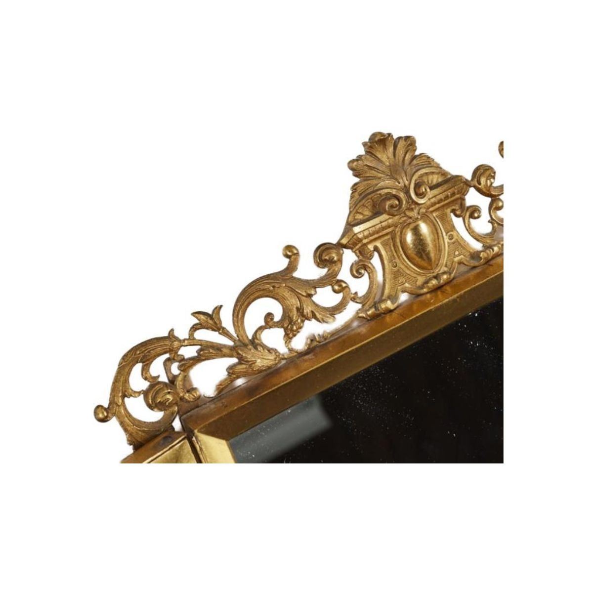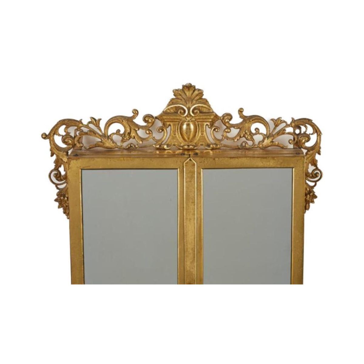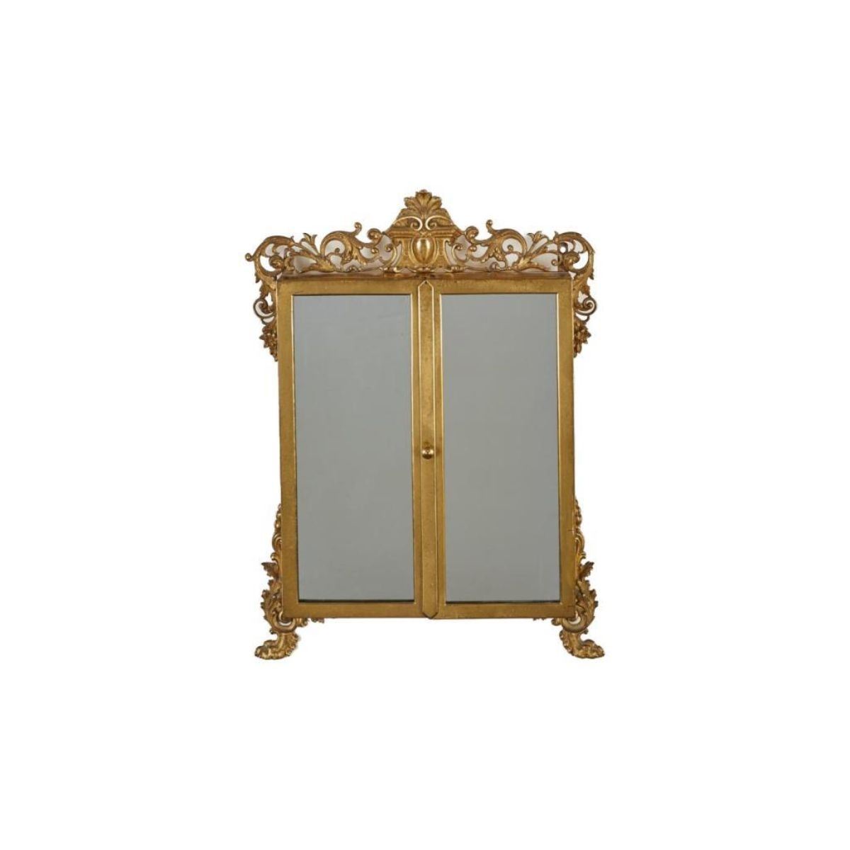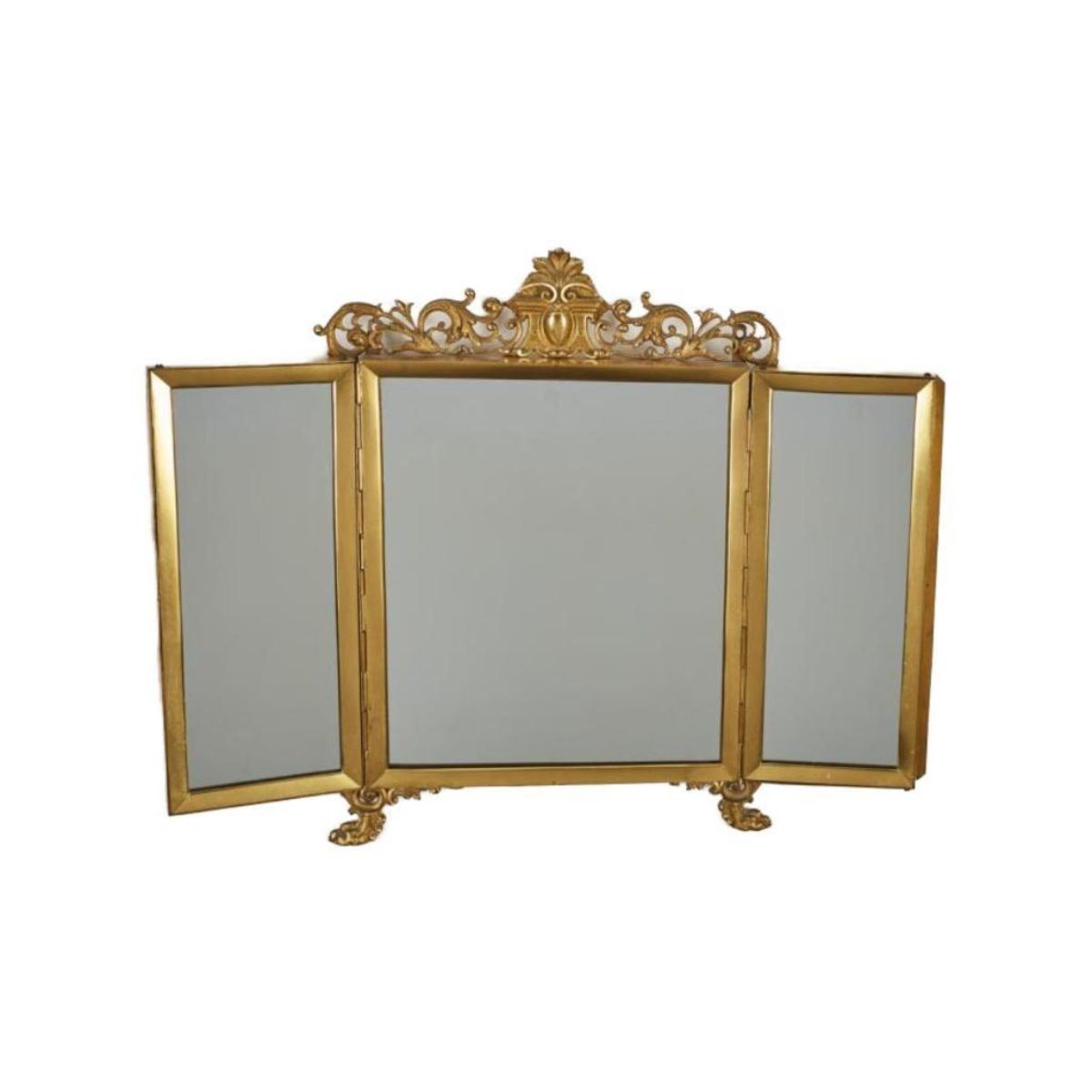French 19th century gilt brass traveling folding mirror. The solid brass gilt mirror is topped with a cast acanthus and shield design and fitted at the bottom with claw feet. Measures 23.5 inches high x 17 inches wide. Good condition The mirror when opened, measures 16.5 inches high 20 inches wide. - 9094-012018-IN-00346