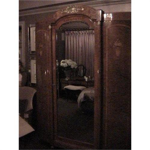 French Piece, beautiful armoire with marketry. Perfect for bedroom. 3 main components, 2 curved doors, with big mirror door in the middle. Mirror door opens to the tv set(tv not icluded). Many draws to put all your clothing. Great for Husband and wife. A must Have!