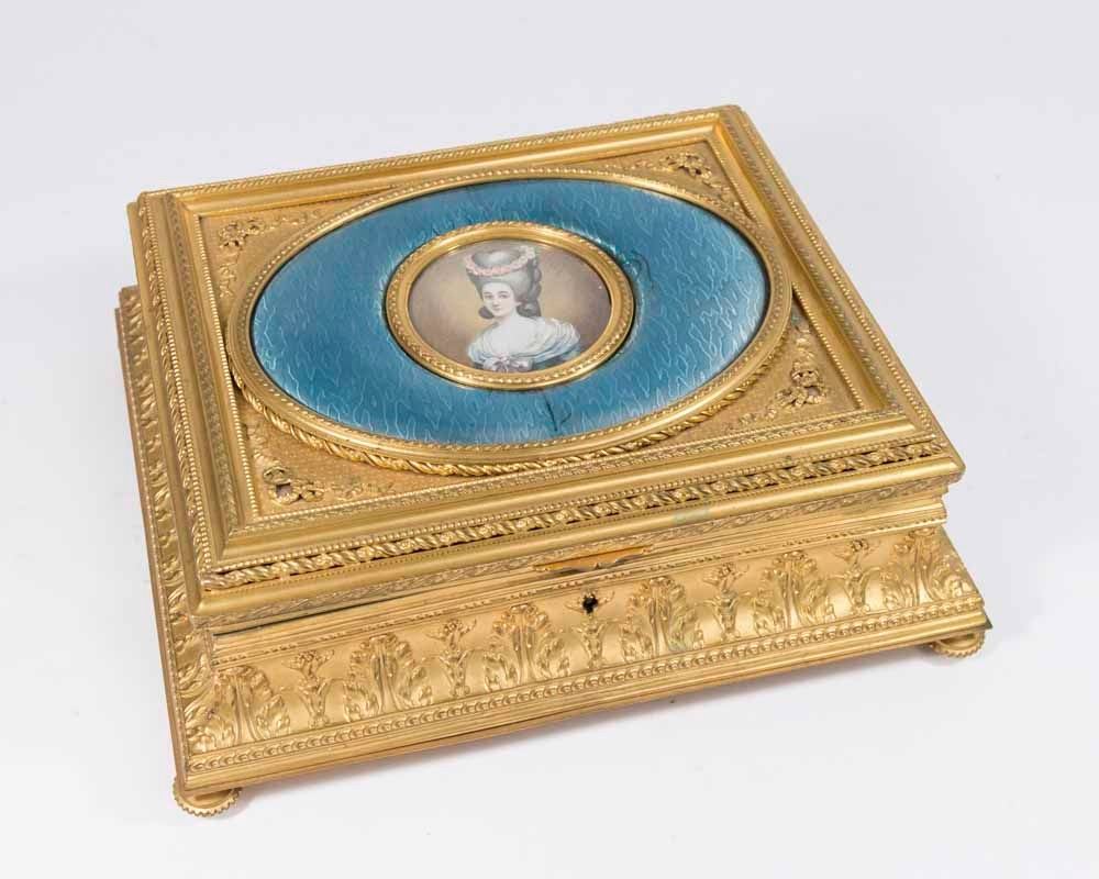Inset with a miniature portrait of a lady. Approx. 12" W x 10" D. From an Edgewater, NJ estate. Portrait panel loose. Hinge slightly bent. Enamel has cracks. No key.