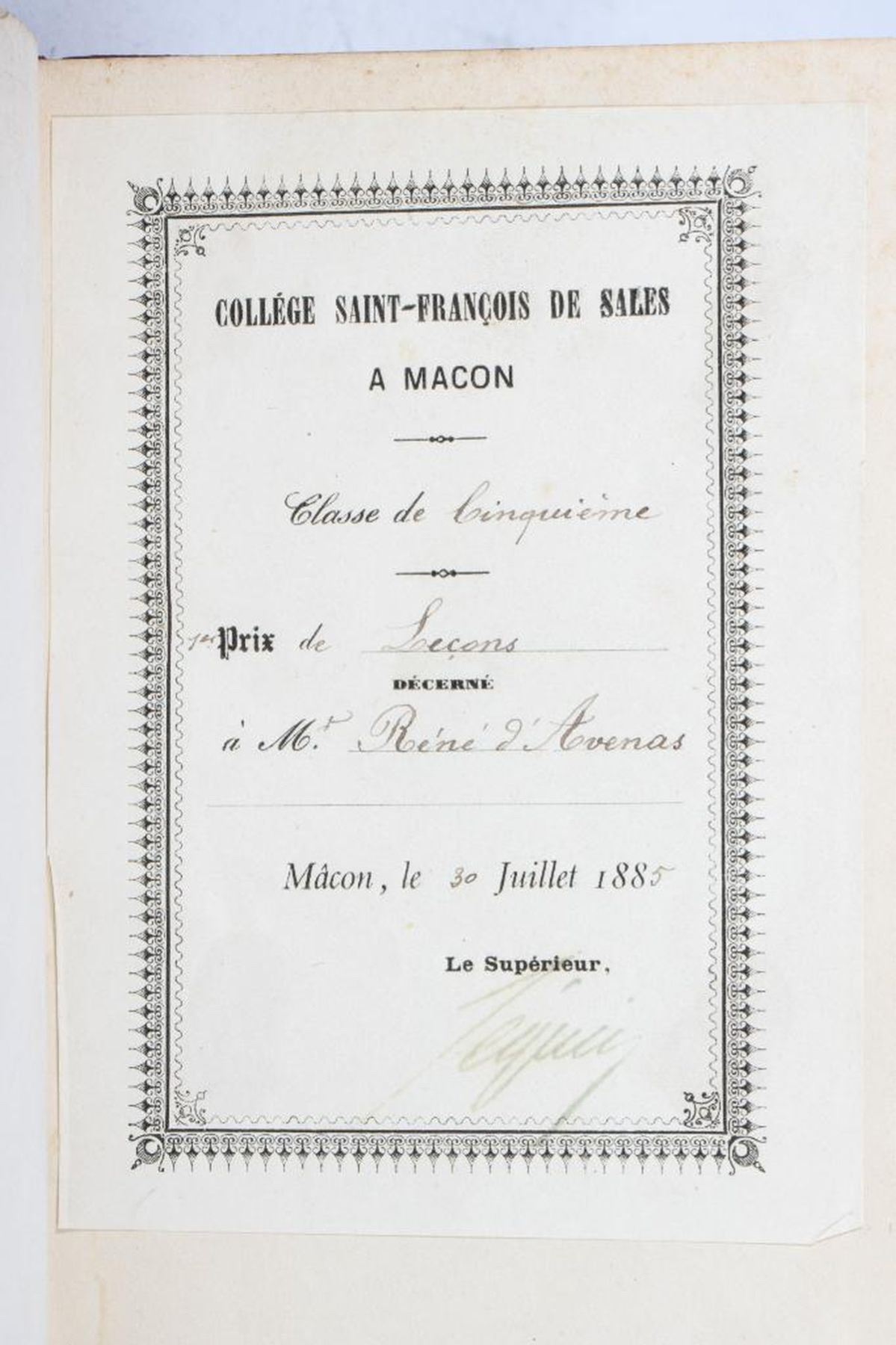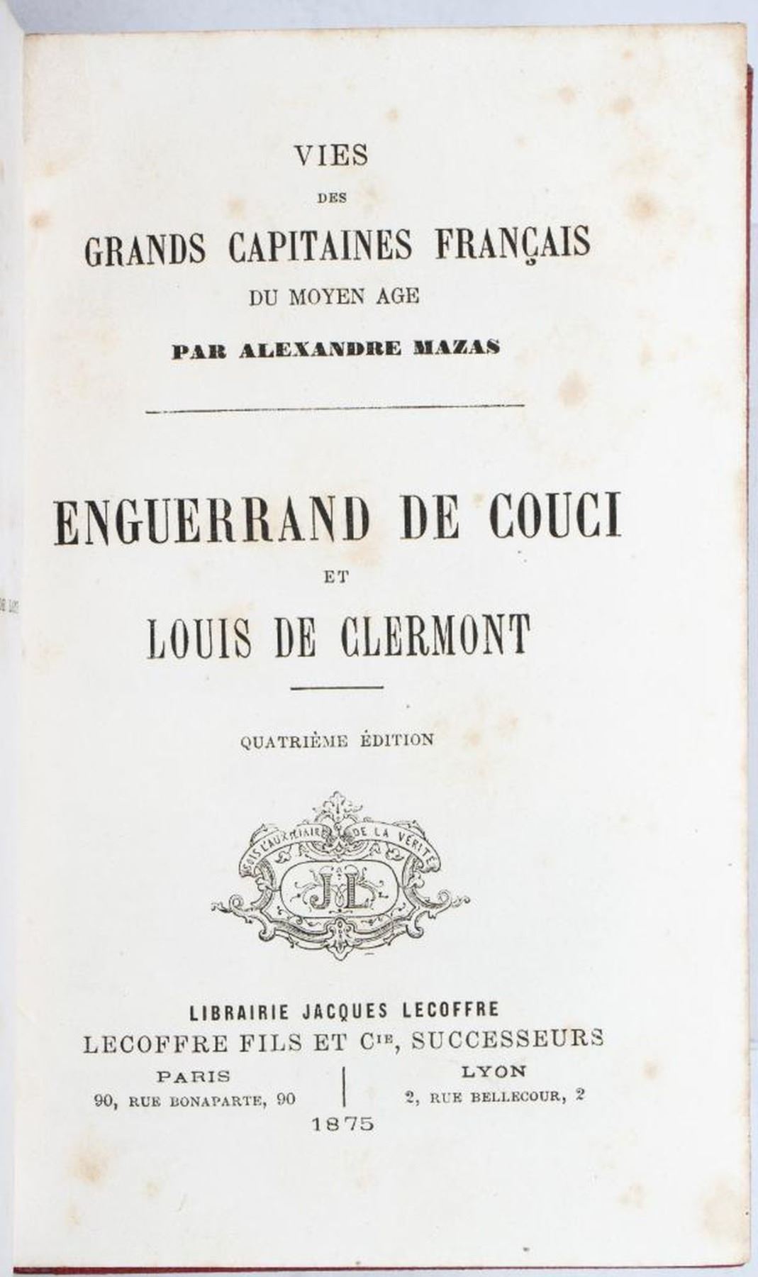 Uniformly bound in red cloth with gilt and raised band spines, marbled endpapers, the covers with gilt garlands reading "Ecole St. Francois de Sales, M con "; published by Lecoffre Fils et Cie, Paris and Lyon; two with inscribed language class certificates on flyleaves; 12mo; all in Good condition, light soiling to covers, foxing and toning. 1. MAZAS, ALEXANDRE. Vies des Grands Capitaines Francais du Moyen Age: Enguerrand de Couci and Louis de Clermont, 1875. 2. MAZAS, ALEXANDRE. Vies des Grands Capitaines Francais du Moyen Age: Mathieu de Montmorency & Gaucher de Chatillon, 1875. 3. NETTEMENT, M. ALFRED. Suger et Son Temps, 1868.
