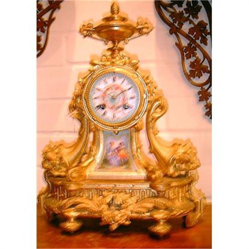 19th c French guilt striking mantle clock, with fine hand painted porclein panels. In good working order.All original.approx 1880. A beautiful decorative clock.