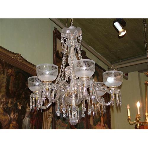 Fantastic 6 Lights crystal chandelier, , clean and rewired, with fine acid etched shades. Best quality bohemia lead cut crystal pendants and some Baccarat pieces too, For those asking how to recognize good quality lead crystal , please check the second picture, and see the rainbow, the experts can also check the angle of the pendants´s hole, of the Baccarat parts.