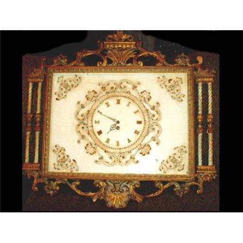 This is just one tremendous huge wood carved key wind clock. The width is 34" and the length is 32" and it is HEAVY. I don?t know that much about clocks except this is key wind and it was working when we stored it before we moved. We lost the key though. This is all carved including the face and has a lot of guilding. The back has two hooks on the frame and one on the back casing of the clock. I know it is old, just not how old. My guess would be pre--1900. Any help on this would be appreciated. The only damage is one of the round pieces at the top right side of the frame is missing the front of the wood. That is the piece about the size of a silver dollar. Could easily be reguilded and would not show since there is so much work in this with the pillars and decoration. It is MUCH nicer in person. This one does not qualify for free shipping and will require insurance. Approx shipping is about $50.00 fed ex in the US. International will be more.I had this marked as sold but the buyer has run into difficulties so I am relisting it.