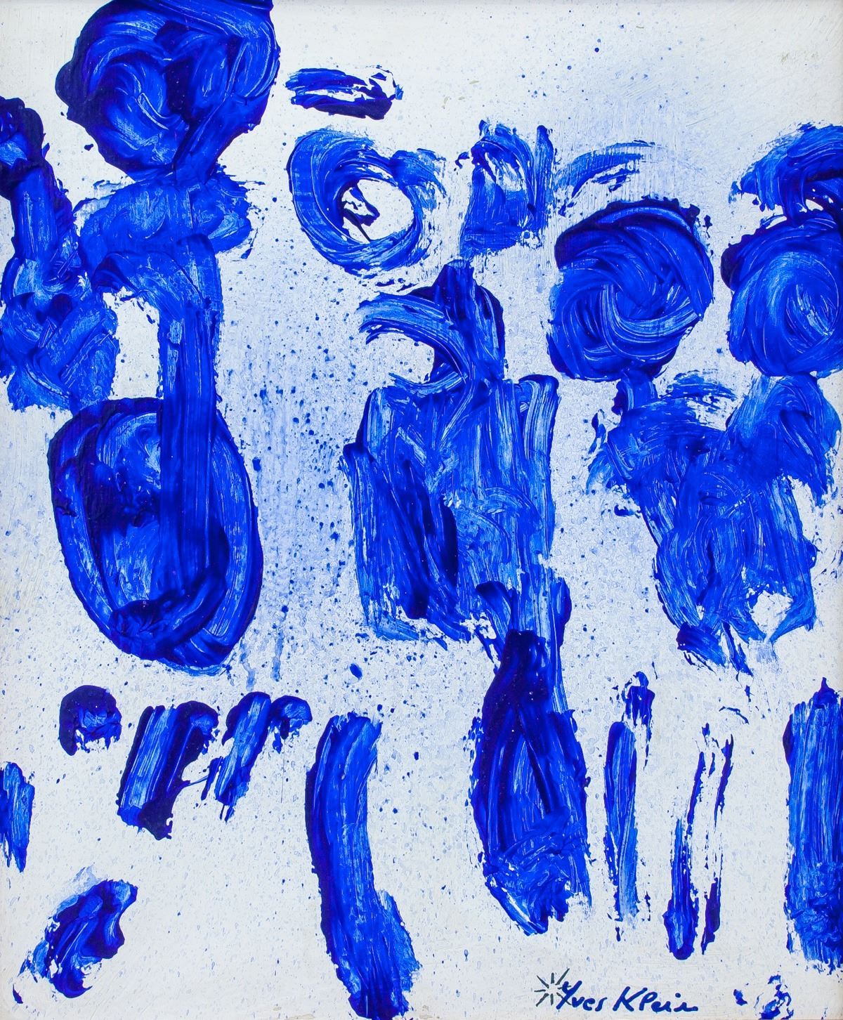 Yves Klein (French, 1928-1962) is best known for his trademark ultramarine pigment, which he patented as International Klein Blue in 1961. "Blue…is beyond dimensions, whereas the other colors are not," he said. "All colors arouse specific ideas, while blue suggests at most the sea and the sky; and they, after all, are in actual, visible nature what is most abstract." Starting in the mid-1950s, Klein made retinal blue monochromes (which would prove cornerstones of Minimalism) and the pigment would also feature prominently in his Anthropometry paintings, for which Klein smeared nude women with blue pigment and used them as human brushes on canvas, sometimes in elaborate public performances.