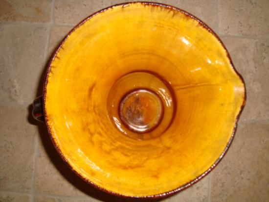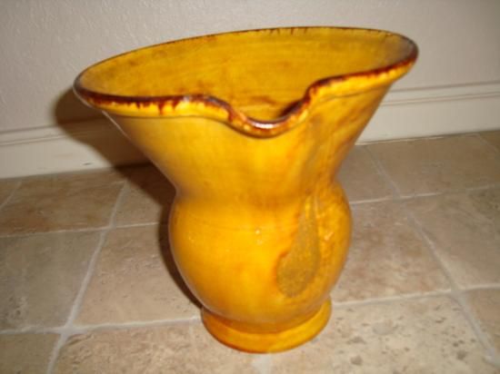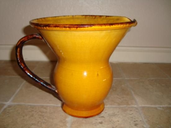 HIGHLY COLLECTIBLE ANTIQUE PIECE of POTTERY FROM ALSACE (Eastern France) Charming Alsatian Milk pitcher (Pot a lait), dating around 1890's, comes from many different villages throughout the region. This colorful yellow "terre vernissee" hails from Weyersheim, near Strasbourg. Great condition (no cracks, no chips)! Our prices are very reasonable because we buy directly in France. We ship from Texas (not from France).h-6.75/ w-7/ d-5