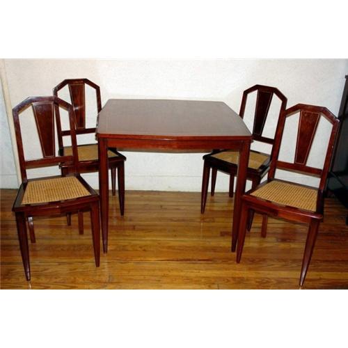 Elegant French Art Deco dining set of a square table and four chairs. Some consider this set a games table set. The chairs and table are made of solid mahogany with pairwood inlay. The seats are HAND WEAVED and are ORIGINAL!!! The set is in perfect shape and has recently been restored and hand polished. In summary: elegance and grace.