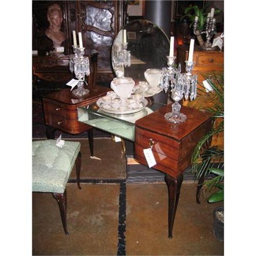 <table width="100%" border="0" cellspacing="0" cellpadding="4"><tr><td><em> </em></td></tr><tr> <td width="100%"> French Art Deco vanity in the Dominique style in rosewood and mahogany with original mercury glass mirror. From Lyon, c. 1940. Beautiful mercury crumbling. </td></tr><tr> <td> </td></tr><tr> <td>Reference #: X207</td></tr><tr><td>Condition:excellent</td></tr><tr><td>Year:c. 1940</td></tr><tr><td>Country:France</td></tr><tr><td>Height:47.5</td></tr><tr><td>Depth:17.5</td></tr><tr><td>Width:43</td></tr><tr><td>Title:French Art Deco Dominique Style Mirrored Vanity</td></tr><tr><td>Style:Dominique</td></tr><tr><td>Materials:rosewood, mahogany, and original mercury glass mirror</td></tr><tr><td>Location:Austin, TX</td></tr></table>