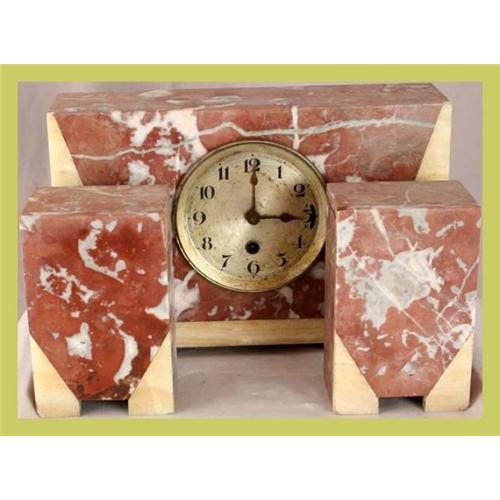</STRONG>Title: 1950 French Pink/Cream Art Deco Garniture Clock Set </STRONG><P>Item #: 7-458-0</P><P>Comment: A very pretty set with great Art Deco styling!</P><P>Condition: In overall good condition. Shows significant wear to face, bezel is missing and there are miscellaneous fleabites along the edges of the garniture pieces due to age and use.</P><P>Dimensions (in.): Clock: 8H x 12W x 3.25; Garniture: 6h x 4W x 2.75D </P><P>Age (ca.): 1950</P><P>Origin: France</P><P>Color: Pink/Cream</P><P>Style: Art Deco</P><P>Material: Marble</P><P>Object: Garniture Clock Set</P><P>Piece Type: Clocks/Barometers</P>French Garniture Clock Set Pink/Cream Art Deco Marble
