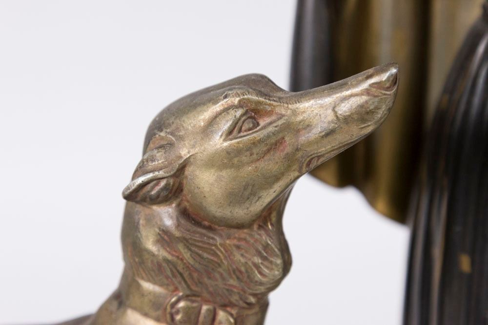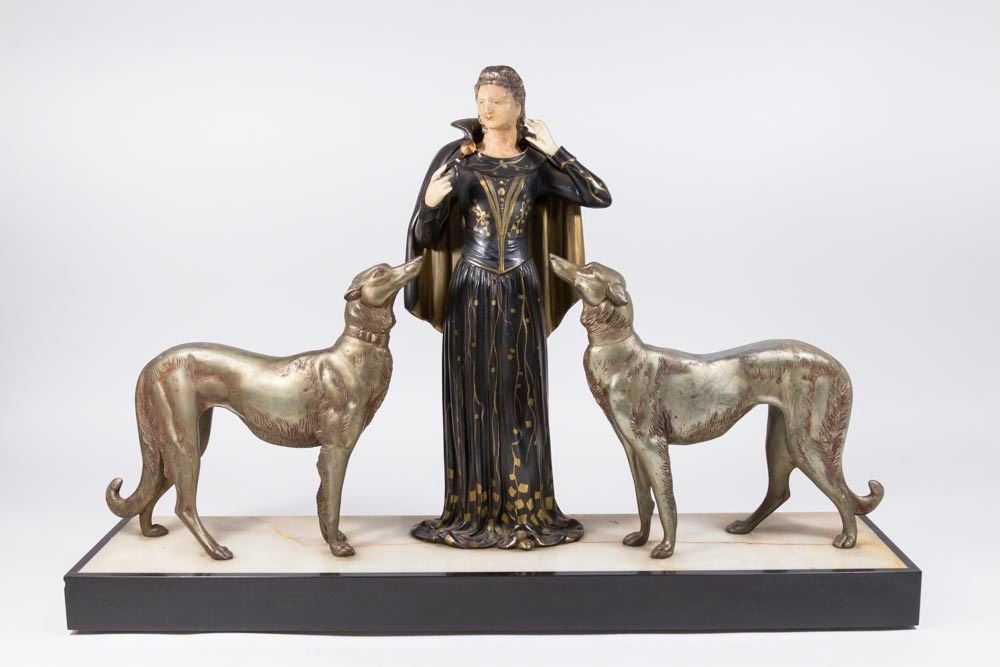 Mounted on white and black marble base. Woman with 2 dogs. Composition head and hands. Approx. 20" H x 29" W. Head as is.