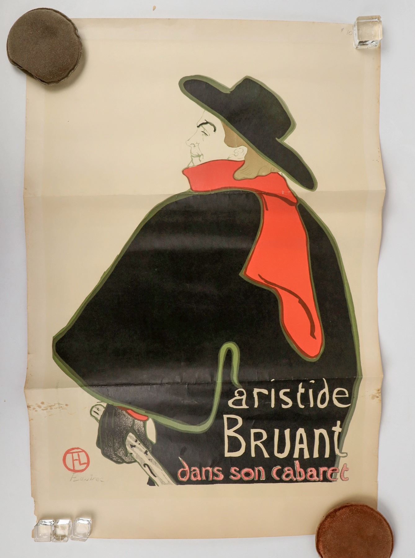 2. H. Lautrec: artiste Bruant dans cabaret. undated, no printer shown. horizontal folds through the art. similar size as above