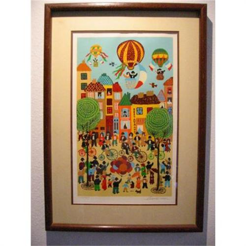 This Lithograph is signed by French Artist Le Mercier and has certificate of authenticity (4th image), The Title, Residence D' Edgar, Original Colored serigraph signed & numbered 195/350. there is a registration number on the back cardboard 3498- as well as 1-4219- and signed by Robert sills Gallery and Mr. sills signature along with the gallery address in los angeles california. features balloons in Street Fair in Paris with vibrant colors. The signature located on the lower right and is numbered on the lower left of the artwork. It is with Original Brown wood frame.This hand painted serigraph is in excellent condition.