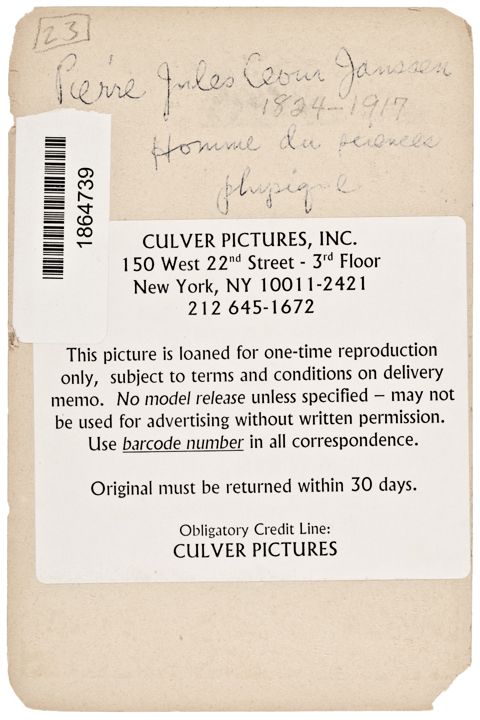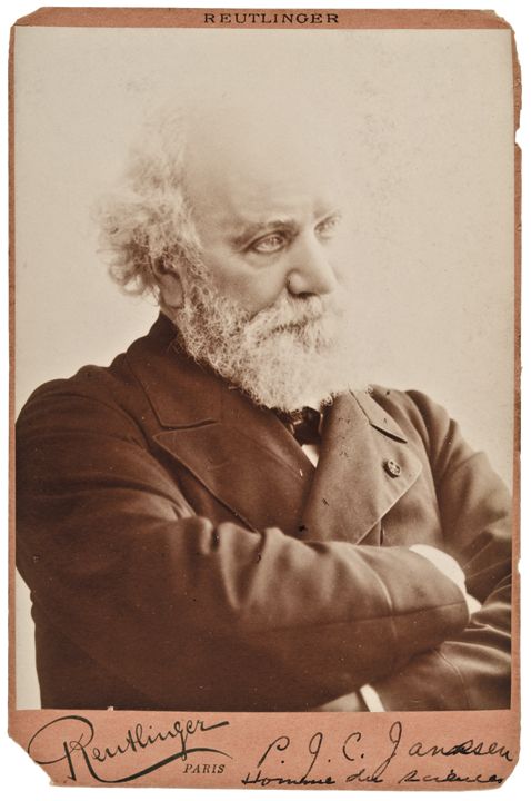c. 1880s Identified in lower margin on its front, with some small loss to corners and rubbing to the outer borders, as shown, loss to back of board from being removed from an album, with archive labels on verso, overall in nice condition for display. Pierre Jules César Janssen (1824 – 1907), usually known in French as Jules Janssen, was a French Astronomer who, along with the English scientist Joseph Norman Lockyer, is credited with discovering the gas helium. Very Rare.