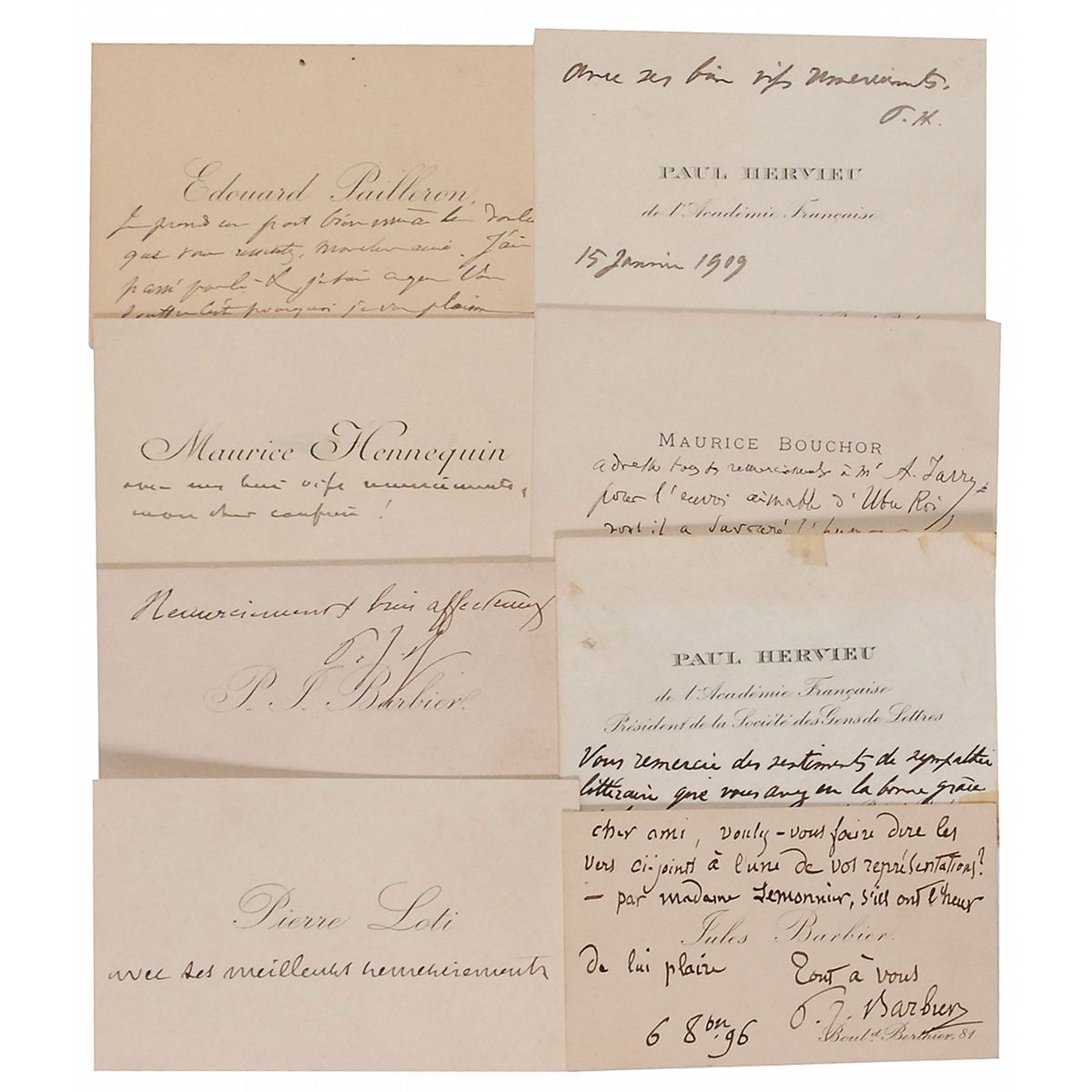 Collection of eight personal calling cards, all approximately 3.75 x 2.25, each bearing a brief autograph note by the card’s owner. Cards are from Jules Barbier (2), Maurice Bouchor, Maurice Hennequin, Paul Hervieu (2), Pierre Loti, and Edouard Pailleron. In overall fine condition.