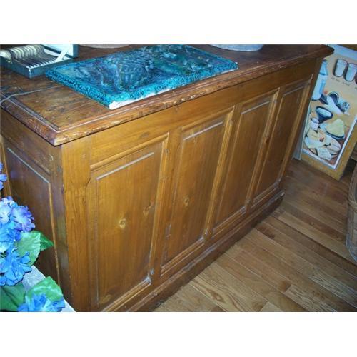 French Banker's desk, but would be great as a kitchen island. Made of solid pine with beveled panels on the back and two sides. Open front with a lower recessed shelf, and two drawers. The top has a lot of wear, but that's part of it's charm. It's already warn, you don't have to be careful if in a kitchen. Some wear on edges at the base and drawers. It's finished on the back and the top is at kitchen counter height. We found this piece in Pezenas, a town in the south of France.