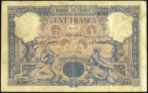 Francia - Biglietto di Banca da 100 Franchi serie H.527 725 datato 23.7.1889