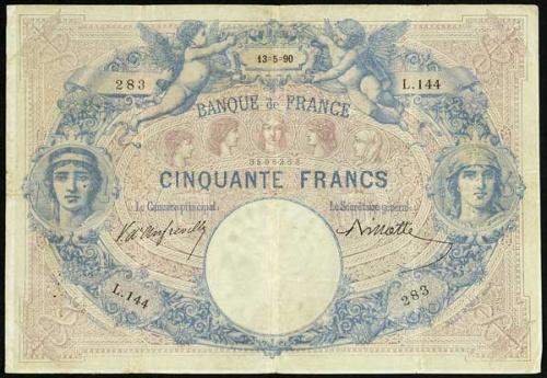 Francia - Insieme di 12 Biglietti di Banca identificati come segue: 50 Franchi N.102 598 del 24.3.1890 - 50 Franchi A.108 065 del 31.3.1890 - 50 Franchi X.109 220 dell'1.4.1890 - 50 Franchi C.119 710 del 14.4.1890 - 50 Franchi L.144 283 del 13.5.1890 - 50 Franchi M.149 059 del 20.5.1890 - 50 Franchi A.151 850 del 22.5.1890 - 50 Franchi B.153 373 del 24.5.1890 - 50 Franchi M.156 785 del 29.5.1890 - 50 Franchi X.243 923 del 10.9.1890 - 50 Franchi C.288 971 del 3.11.1890 - 50 Franchi W.346 547 del 31.1.1891