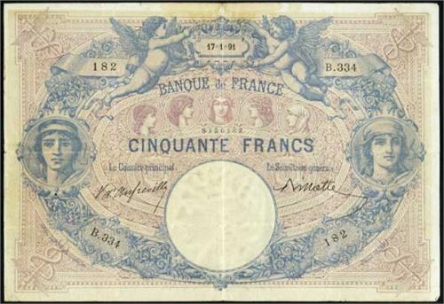 Francia - Insieme di 12 Biglietti di Banca identificati come segue: 50 Franchi Y.100 426 del 21.3.1890 - 50 Franchi R.115 332 del 9.4.1890 - 50 Franchi V.121 374 del 16.4.1890 - 50 Franchi K.147 518 del 17.5.1890 - 50 Franchi U.158 688 del 31.5.1890 - 50 Franchi N.177 737 del 23.6.1890 - 50 Franchi Y.184 728 dell'1.7.1890 - 50 Franchi A.236 729 del 2.9.1890 - 50 Franchi L.281 517 del 24.10.1890 - 50 Franchi G.297 749 del 13.11.1890 (unica banconota incollata con nastro adesivo in epoca moderna) - 50 Franchi B.334 182 del 17.1.1891 - 100 Franchi B.1277 744 del 23.3.1893