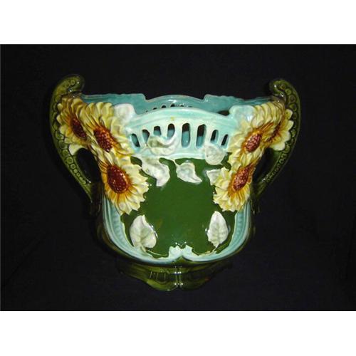 Circa. 1890 Sunflowers. Great colors. In pristine condition. This is a rare and wonderful piece of majolica: For the serious collector </td></tr><tr> <td> </td></tr><tr> <td>Reference #: JBDT82</td></tr><tr><td>Condition:Pristine</td></tr><tr><td>Year:1890</td></tr><tr><td>Country:France</td></tr><tr><td>Height:10</td></tr><tr><td>Depth:11</td></tr><tr><td>Width:14</td></tr><tr><td>Title:French Barbotine Majolica Cache Pot</td></tr><tr><td>Type:Majolica</td></tr><tr><td>Location:New York USA</td></tr></table>