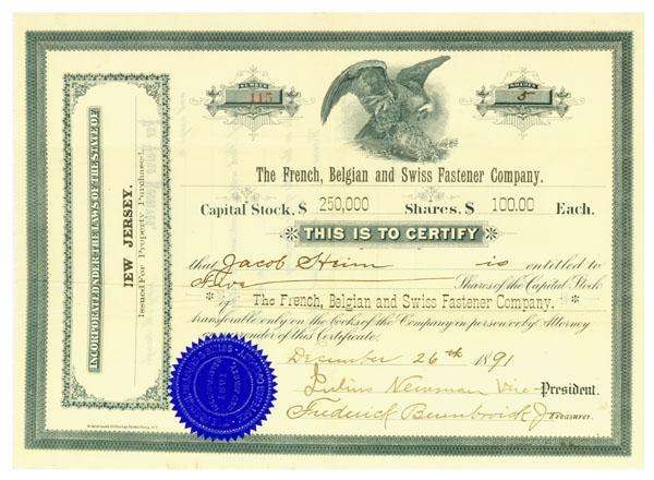 1891, New Jersey. Gray/White with blue seal. Stock certificate for 5 shares. Vignette of eagle with spread wings at top center.