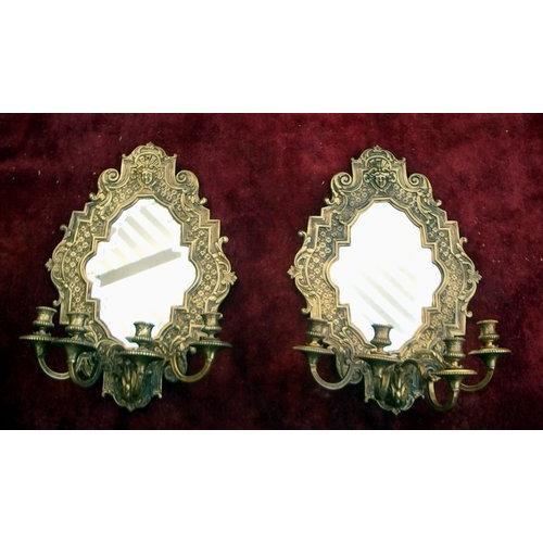 Tow finely crafted French sconces with intricately created, multi-angled, rich beveled mirrors set in ornate gilt metal bases. Circa 1920s. h. 20" w. 14" d. 11".