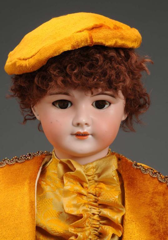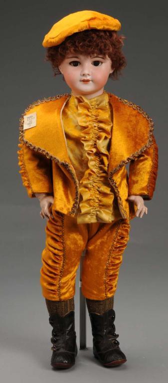 French, circa 1900. Bisque socket head incised "SFBJ 301 Paris". Brown sleeping eyes, open mouth with teeth, pierced ears, replaced lamb’s wool wig, and original French jointed composition body with working mama/papa strings. Redressed in very attractive gold velvet. Hairline across forehead. Condition (Excellent). Size 25" T.