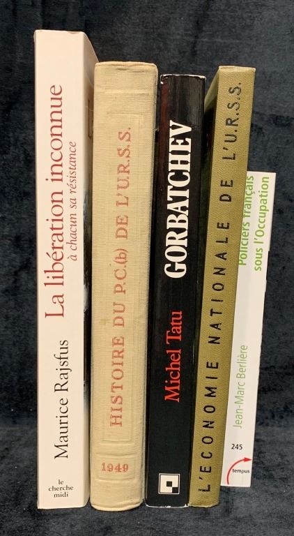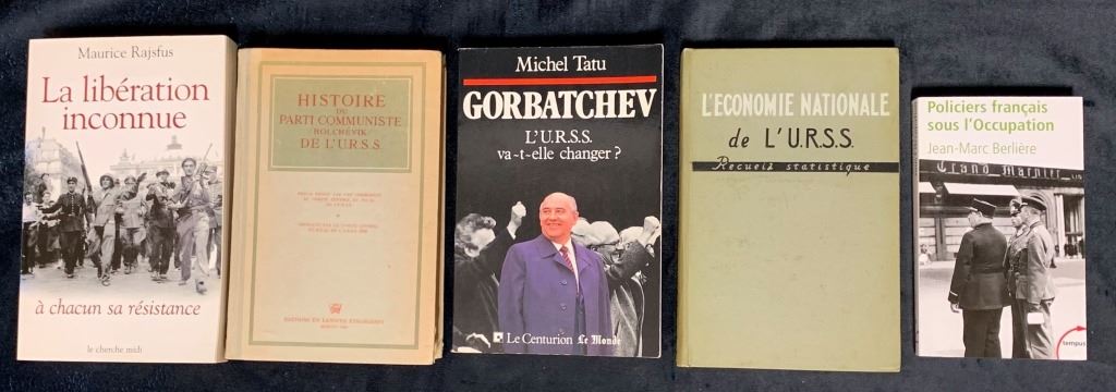 A collection of 5 French books, about the USSR, occupation, and liberation from WWII. Titles include, "Policiers Francais sous l'Occupation", "Histoire du Parti Communiste de L'URSS", "La Liberation Inconnue", " Gorbachev", and"L'Economie Nationale de L'URSS".