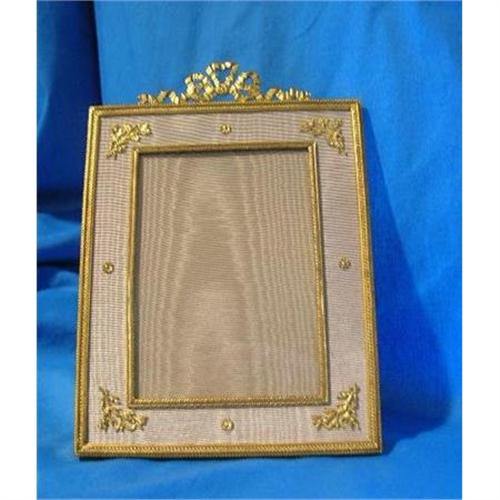 French Bronze Dore Pictur Frame with mat of beige moire embellished with decorative bronze leafed branches and rondells. It stands 8.75" high and 6.26" wide with the picture insert measuring 5.5" x 4". Shipping/Insurance will be quoted at the time of purchase and are the responsibility of the purchaser.