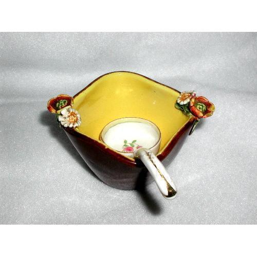 Unique little earthenware square sauce or condiment bowl has dark brown exterior with a bright yellow interior. Applied floral on either side in dark red rose,yellow and white with green leaves. Marked on the bottom "Bonwit Teller Made in France 21". The accompanying porcelain ladle is made by Nippon-hand painted as shown on bottom. The two compliment each other with white background,yellow rim lined in green and rose floral in the center. Gilt surrounds the rim and down center of the handle. Both in excellent condition. Bowl measures 3.5L X 3.5D X 2.5H. Ladle is 5L X 1.75W X .75D.
