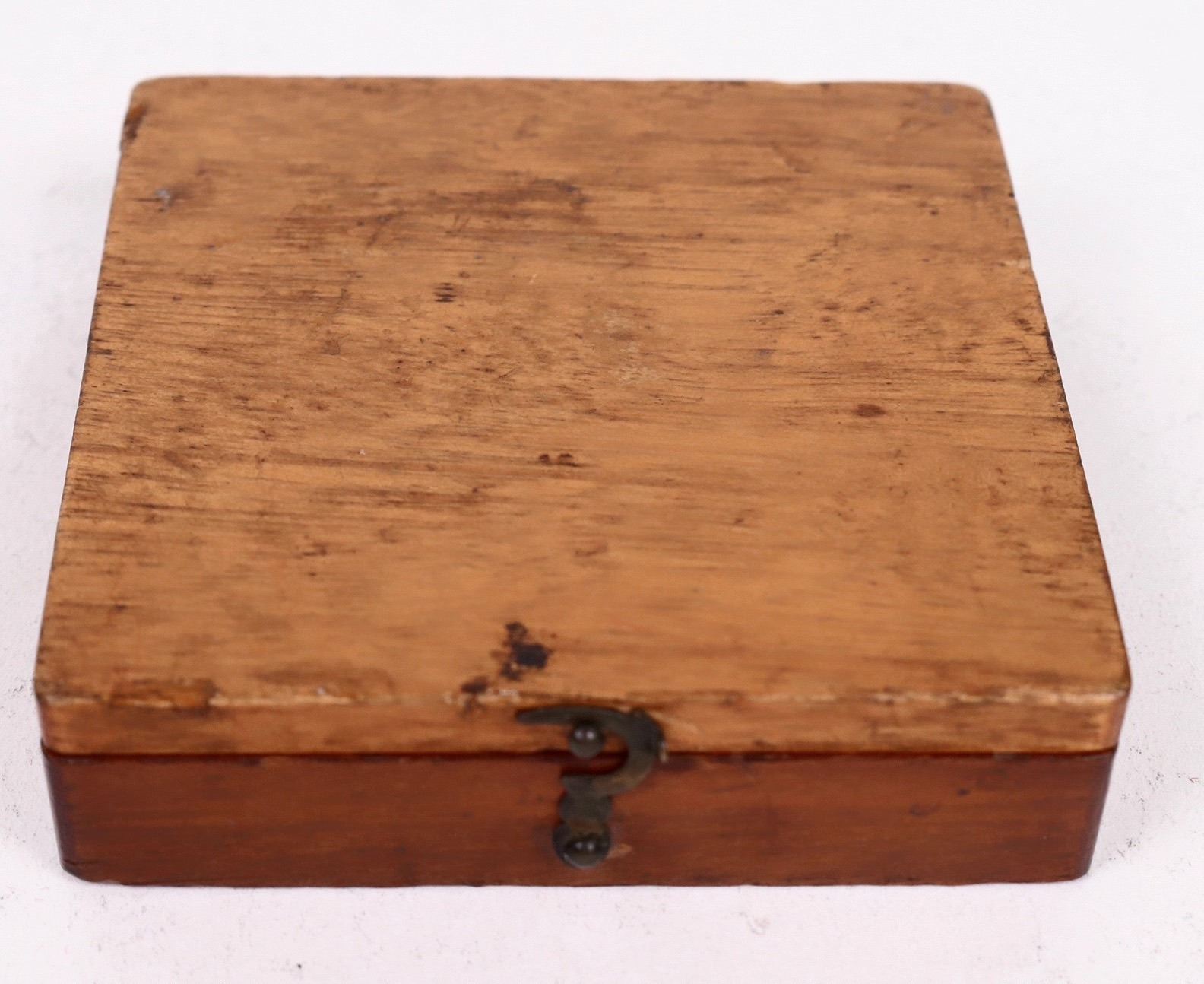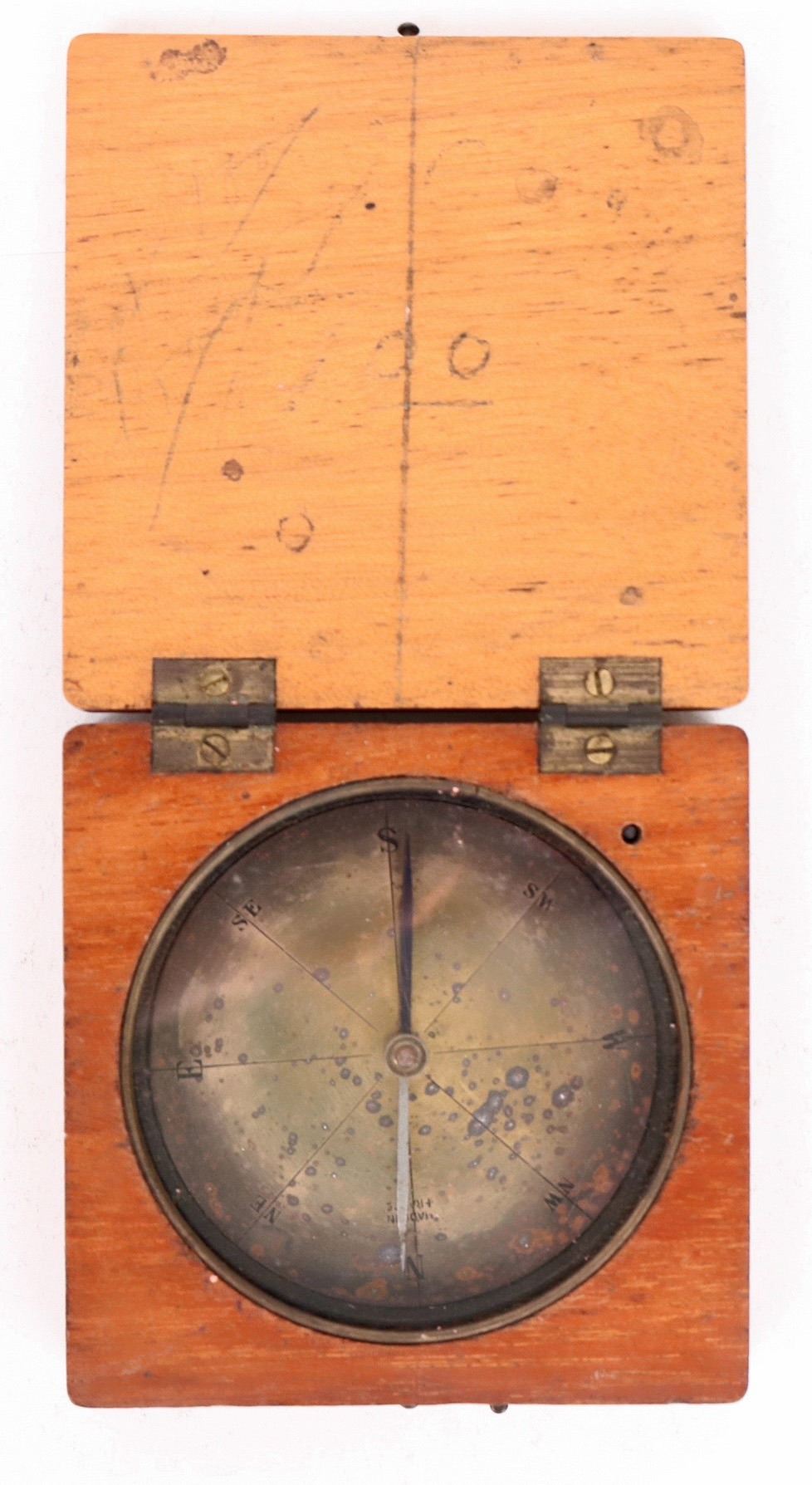 This is a French made box compass. About 1900. The card is spotted with light quadrant markings. "Made in France" in the north position. The wood is mahogany, and the lock button is stuck open. 3 in. X 3 in. Please see photo for details.
