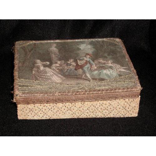 Old world charm in this late 19th century fabric beaded French box. The top is graced with a hand colored engraving,protected by a form of plexiglass and surrounded by deep green ribbon trim. All four sides of the lid are covered in old gilt toned tim. The bottom is fabric with four brass feet. Interior with padded lid is fabric lined. In remarkably good condition,with the right side being slightly indented from use which causes the lid to sit slightly ajar. Measures 8L X 7D X 2.25H.